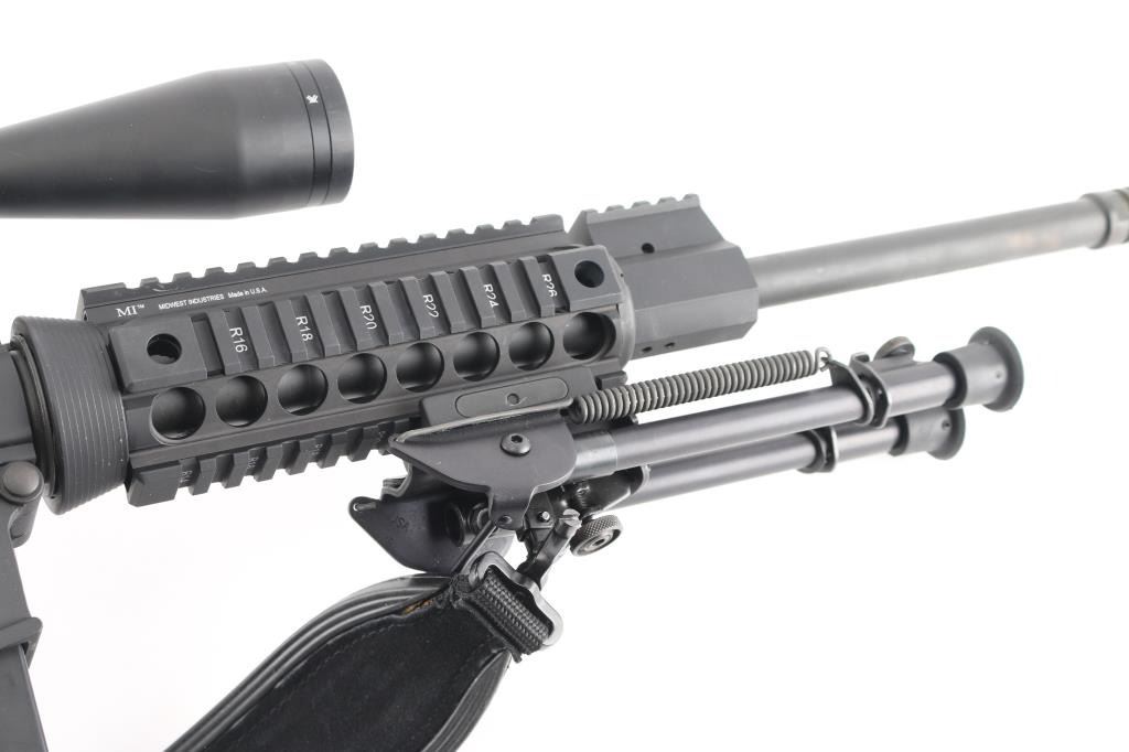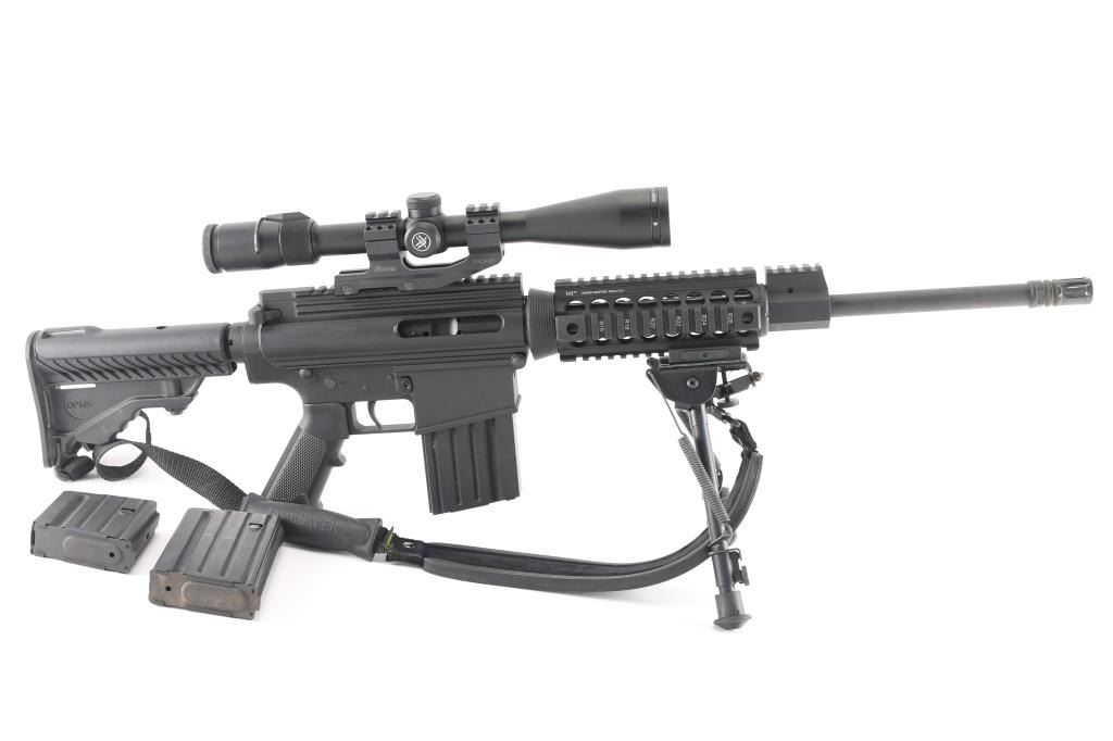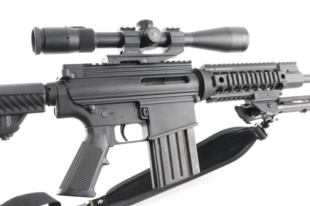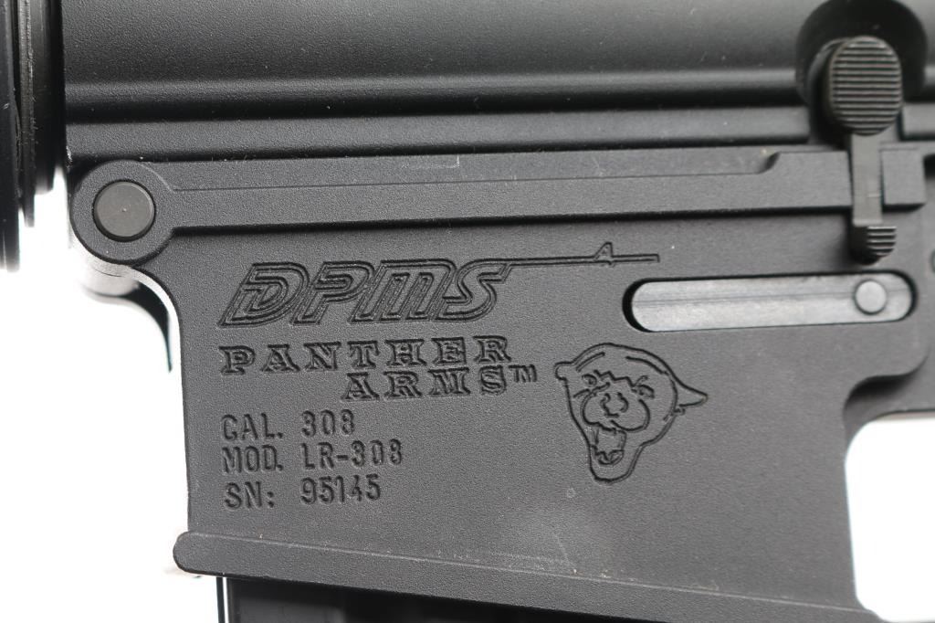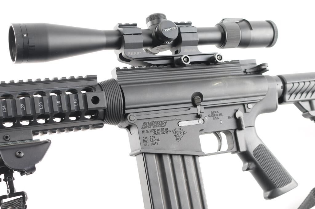 Panther Arms gas operated semi-automatic rifle based on the AR-10 design, similar to the AR15 scaled to accept larger, more powerful cartridges. Features a matte black finish, black polymer furniture, 7.62x51mm 16" chrome lined barrel with 1-10 twist, 4 flute flash hider, mid-length gas system with low profile rail-top gas block, flat-top upper receiver with integral rail , manual safety, push button magazine release, sling swivels, A2 pistol grip, Midwest Industries quad-rail handguard, and collapsing DPMS shoulder stock. Textured grip with finger groove. Mounted with a Vortex Viper 4-12X40 scope with Mil-Dot reticle, clear optics, Burris P.E.P.R base/rings, Padded black nylon sling and adjustable bipod attached Bore is excellent/bright. Rifle exhibits approximately 98% of its original matte black finish showing only a few light handling marks & scuffs along barrel. Polymer stocks are fine. Includes two DPMS 20 rd magazines and one 10 rd magazine. (3) total..Condition is NRA Excellent/ Modern Firearm.