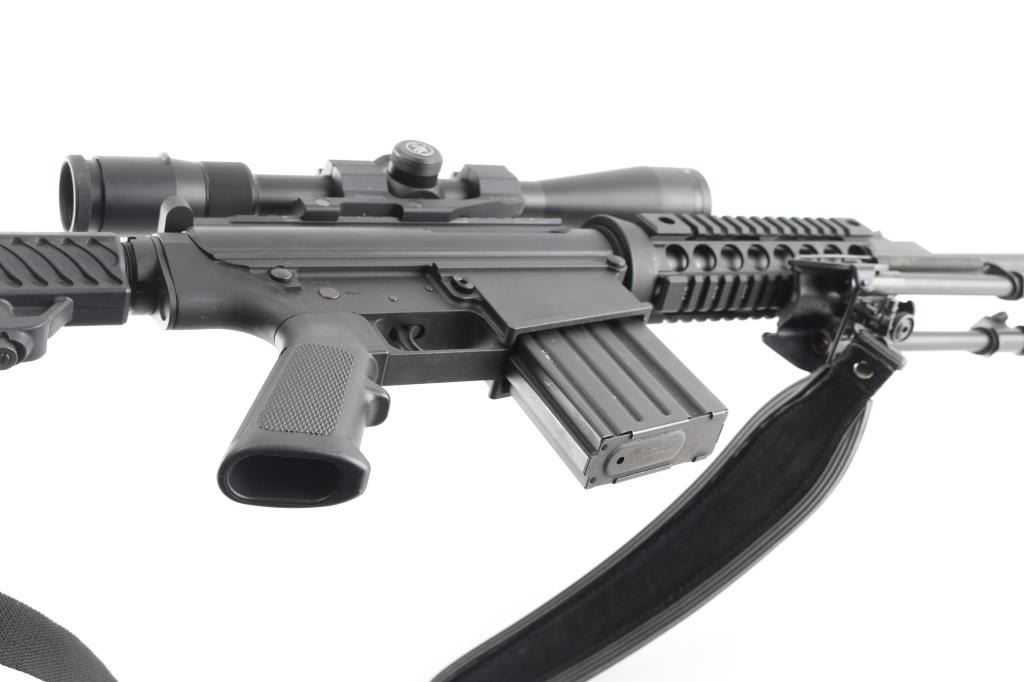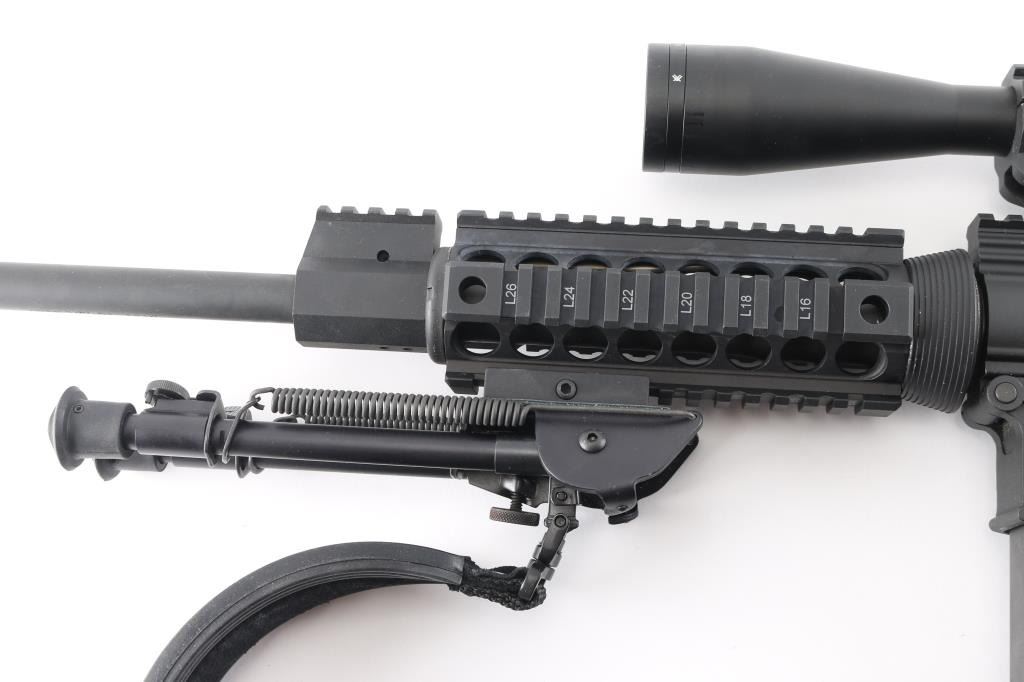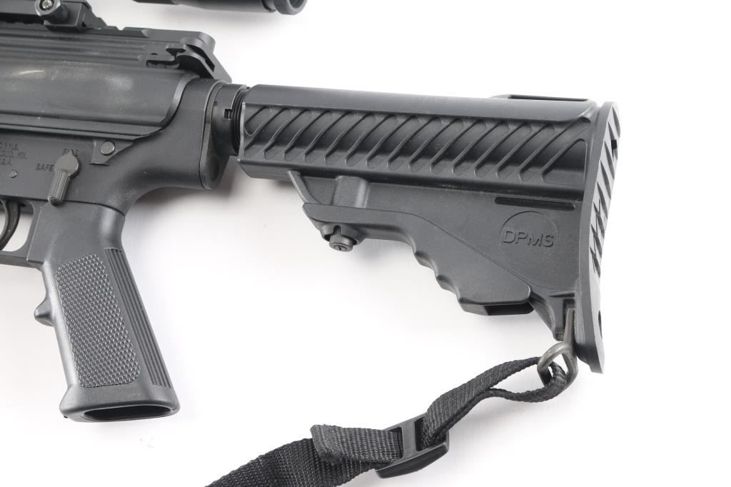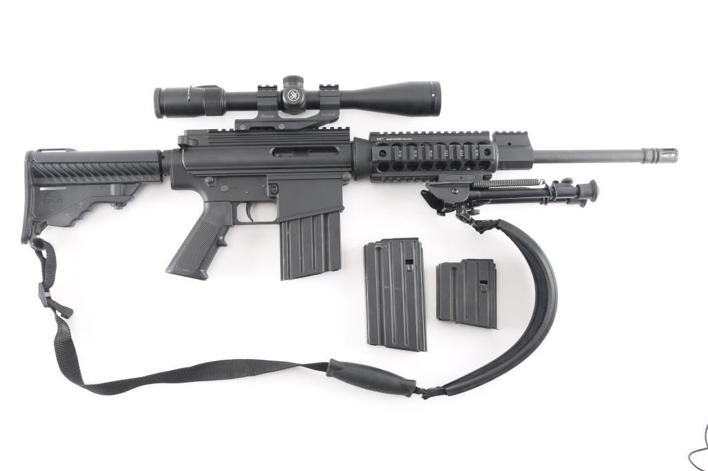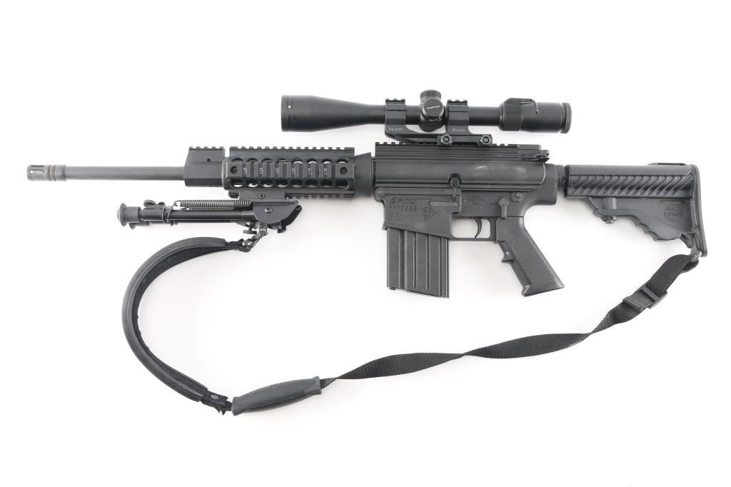 Panther Arms gas operated semi-automatic rifle based on the AR-10 design, similar to the AR15 scaled to accept larger, more powerful cartridges. Features a matte black finish, black polymer furniture, 7.62x51mm 16" chrome lined barrel with 1-10 twist, 4 flute flash hider, mid-length gas system with low profile rail-top gas block, flat-top upper receiver with integral rail , manual safety, push button magazine release, sling swivels, A2 pistol grip, Midwest Industries quad-rail handguard, and collapsing DPMS shoulder stock. Textured grip with finger groove. Mounted with a Vortex Viper 4-12X40 scope with Mil-Dot reticle, clear optics, Burris P.E.P.R base/rings, Padded black nylon sling and adjustable bipod attached Bore is excellent/bright. Rifle exhibits approximately 98% of its original matte black finish showing only a few light handling marks & scuffs along barrel. Polymer stocks are fine. Includes two DPMS 20 rd magazines and one 10 rd magazine. (3) total..Condition is NRA Excellent/ Modern Firearm.