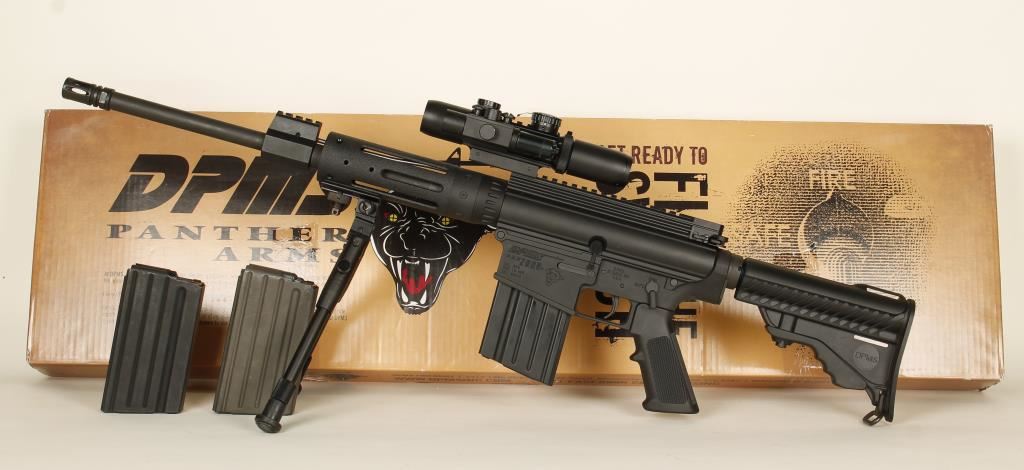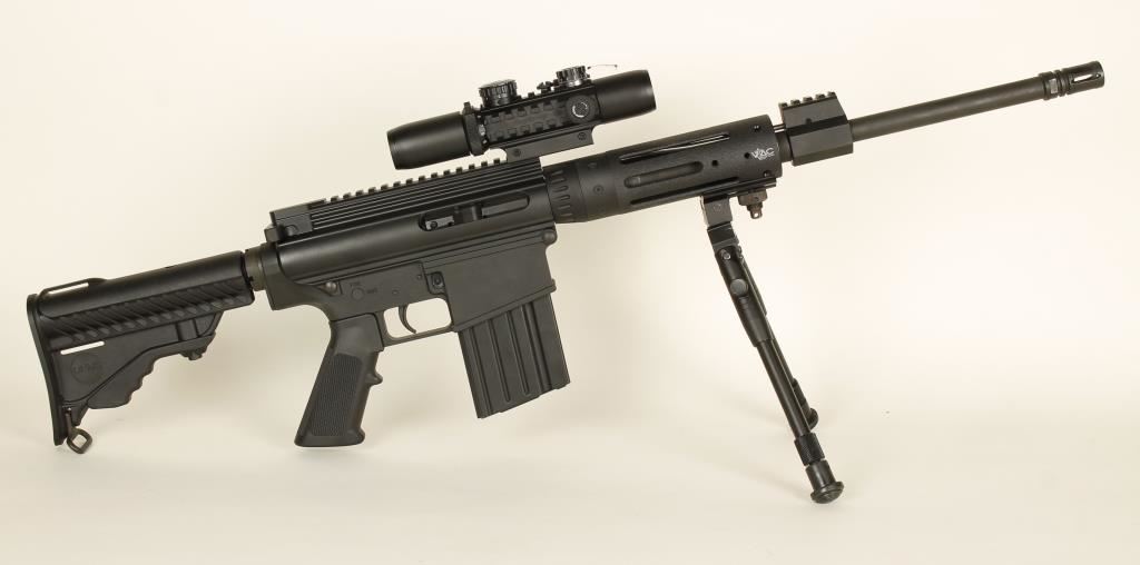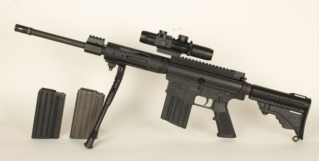 Model: RFLR WCP. Anodized/parkerized semi-automatic rifle in the AR-15 pattern with a 17-1/2" barrel (including the "bird cage" flash hider), folding bipod, collapsible 6-position stock, 3-9 power scope, laser sight, empty chamber indicator, three 20-round magazines, box and target. Finish is dusty with very few rubs and deficiencies. Flat-top receiver with rails on receiver and gas block. Bore is mirror bright with strong rifling. Action is fine. Free-floated heavy barrel. Scope is unmarked and has three accessory rails (one of which holds the laser sight). Lighted reticle in blue with duplex crosshairs and Mil-circle format. Condition is excellent. *Modern Firearm*