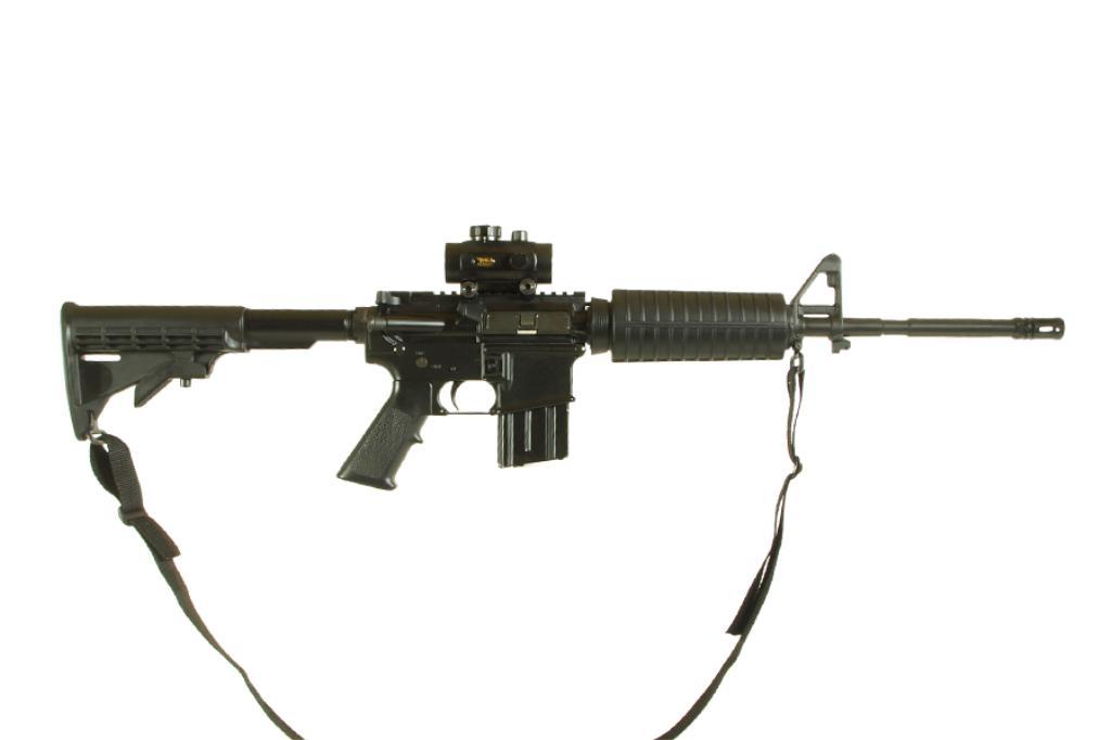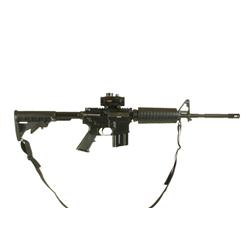 DPMS MDL A-15 Cal .223 SN:F074996K Semi auto black rifle. Bushmaster M4 barrel and upper, DPMS lower and detachable handle, 16" barrel, sling, telescoping stock, Red Dot Scope. Condition: Like new. (Not California legal)