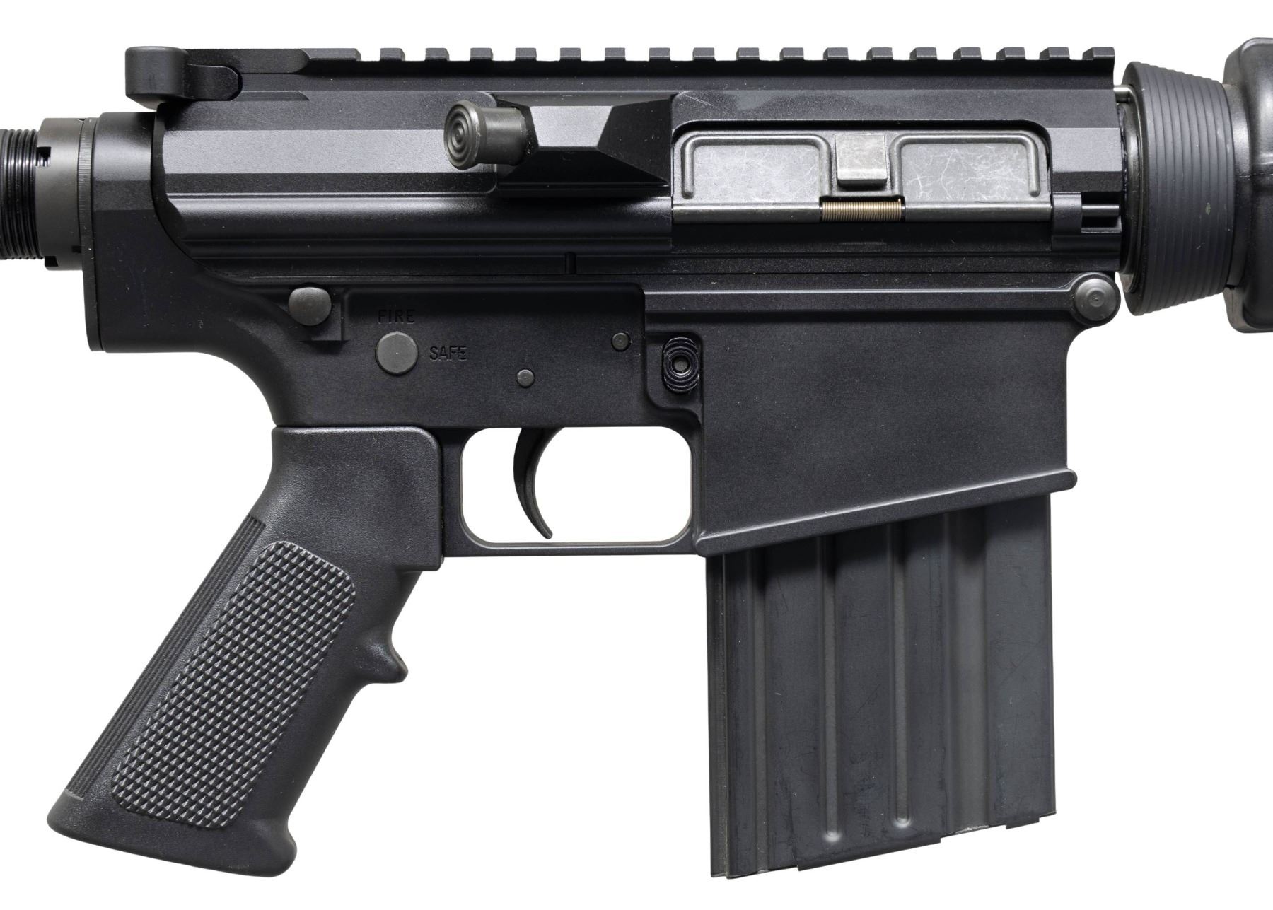 Cal. 308 (or 7.62x51). S# FFK041471. Free floating 16" bbl. w/ 1:10 twist & bird cage flash hider. AR-10 style rifle with Black Teflon finish. Alloy ribbed handguard. A2 pistol grip. Forward assist. 6 Position DPMS buttstock. CONDITION: balance of finish is near excellent with light scratches on buffer tube. Very good shiny bore with a few dark spots. (25-3961/MD). MODERN. $400-600.