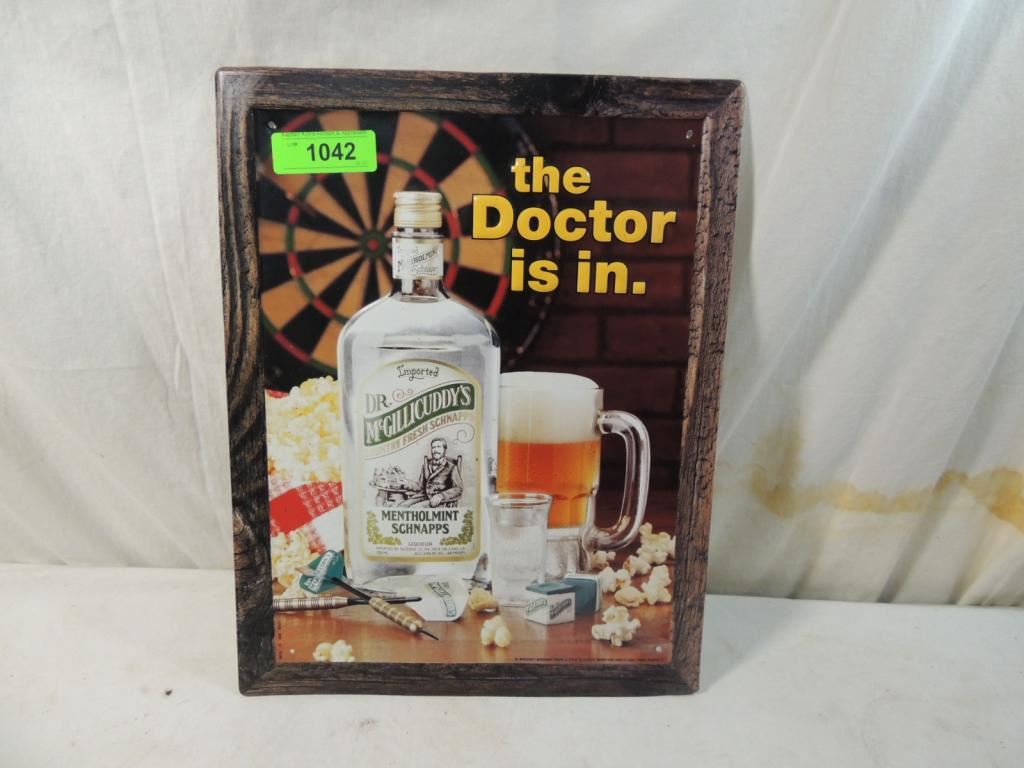 THE DOCTOR IS IN VINTAGE DR. McGILLICUDDYs METHOLMINT SCHNAPPS LIQUOR ADVERTISEMENT SIGN, VINTAGE WALL SIGN, METAL SIGN, BAR SIGN, MAN CAVE SIGN, AS SHOWN SEE PHOTO FOR MORE DETAILS.
