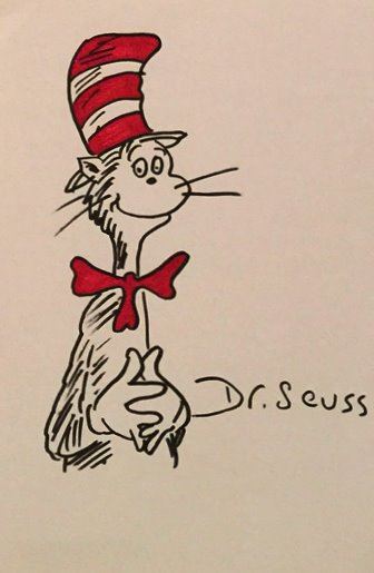 A drawing of Dr Seuss's Cat in the hat by Theodor Seuss Geisel, a.k.a. Dr. Seuss. Theodor began his career as a little-known editorial cartoonist in the 1920s. His intriguing perspective and fresh concepts ignited his career, and his work evolved quickly to deft illustrations, modeled sculpture, and sophisticated oil paintings of elaborate imagination. His artistic vision emerged as the golden thread that linked every facet of his varied career, and his artwork became the platform from which he delivered forty-four children’s books, more than 400 World War II political cartoons, hundreds of advertisements, and countless editorials filled with wonderfully inventive animals, characters, and humor.