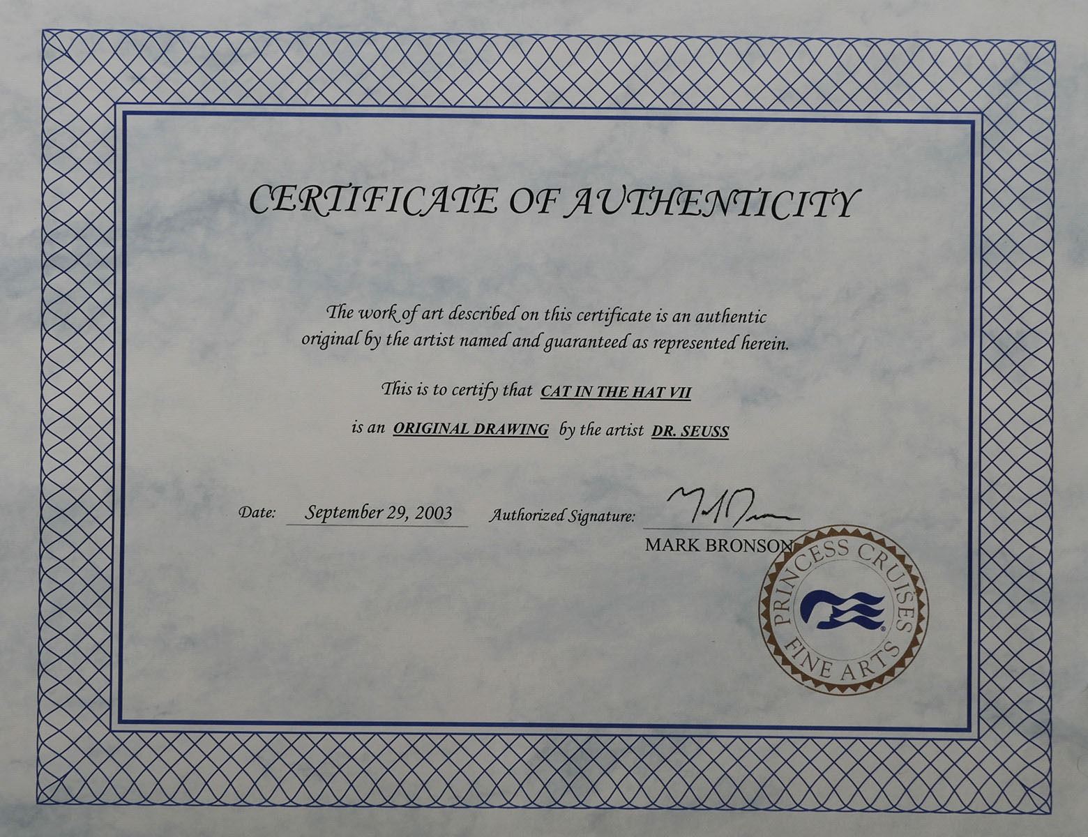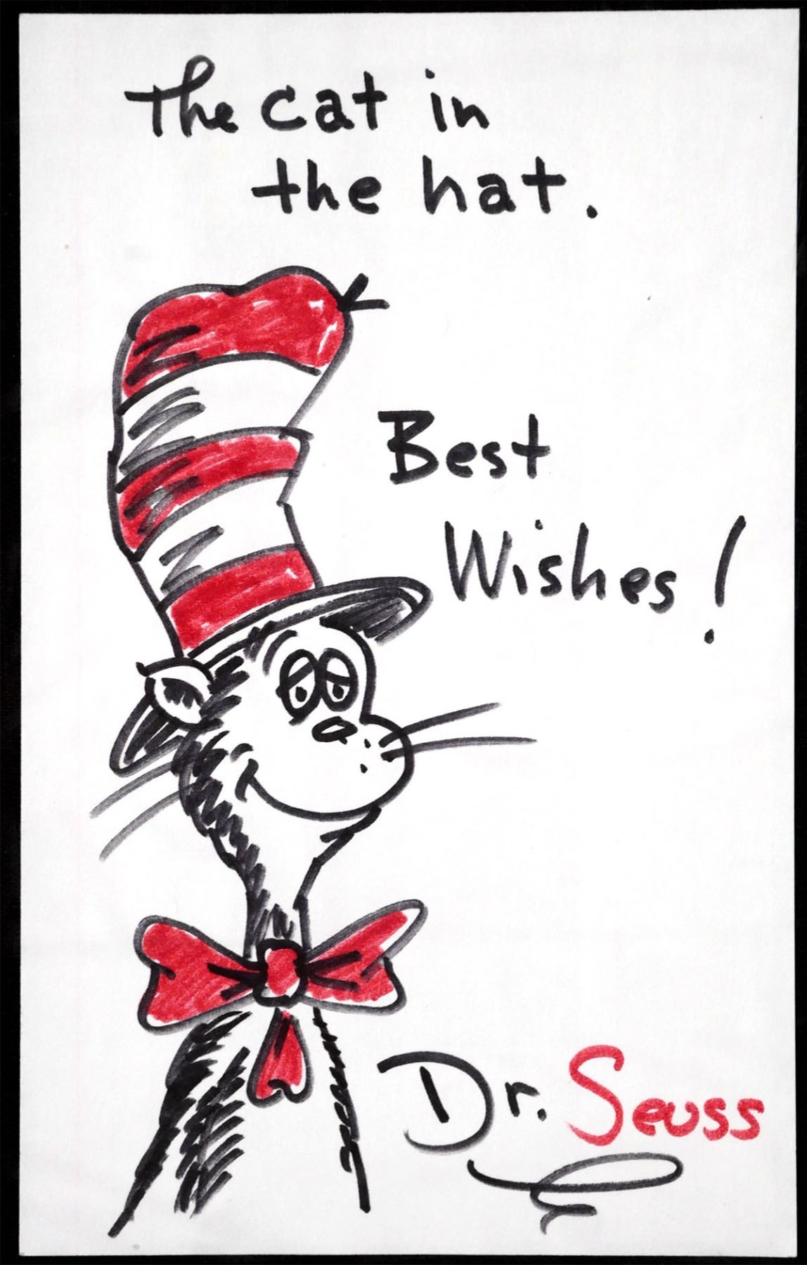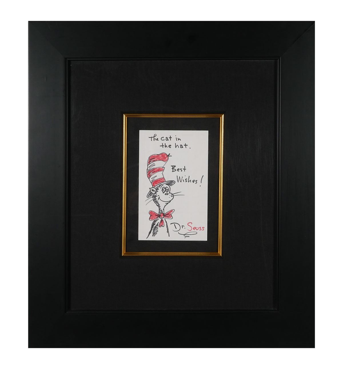 THEODORE GEISEL (1904 - 1992). Original pen and ink sketch of The Cat in the Hat, in two colors, signed "Best Wishes, Dr. Seuss." Excellent condition and nicely framed. Sheet size is 5" x 8", framed to 21" x 24". COA included.