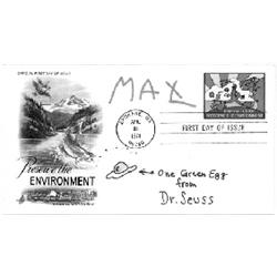 <b>450. THEODORE GEISEL</b> (1904 - 1992)<b> </b>"Dr. Seuss", author and illustrator of children's books and creator of The Cat in the Hat. Fine original drawing of his famous "green egg", hand-colored green of course, with the notation: "<i>One Green Egg from Dr. Seuss</i>", executed on a "Preserve the Environment" first day cover. Also signed by artist <b>PETER MAX</b> as "<i>Max</i>" beside the commemorative stamp bearing his design. Fine condition.<b> $500-700</b>