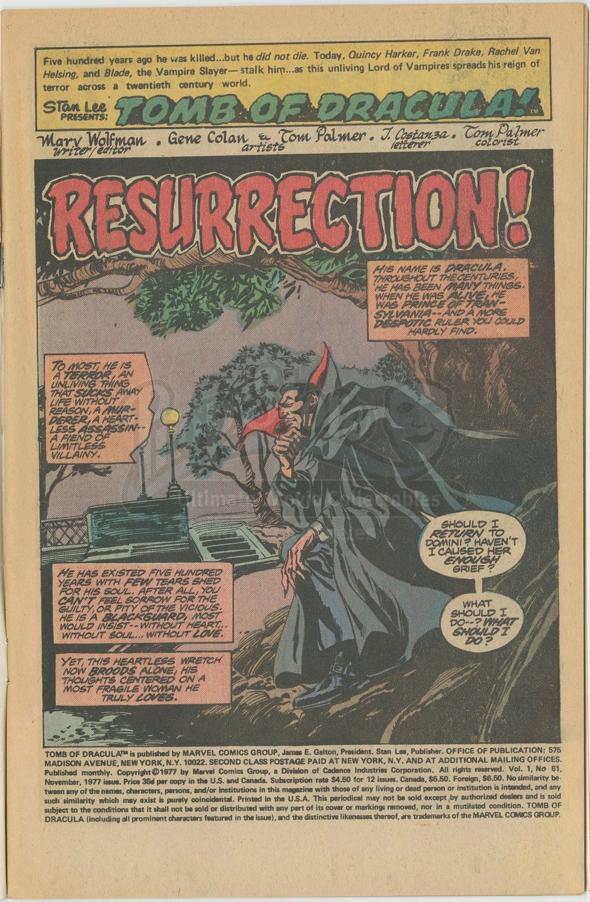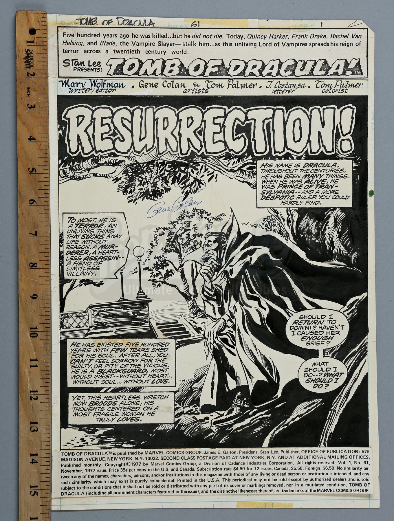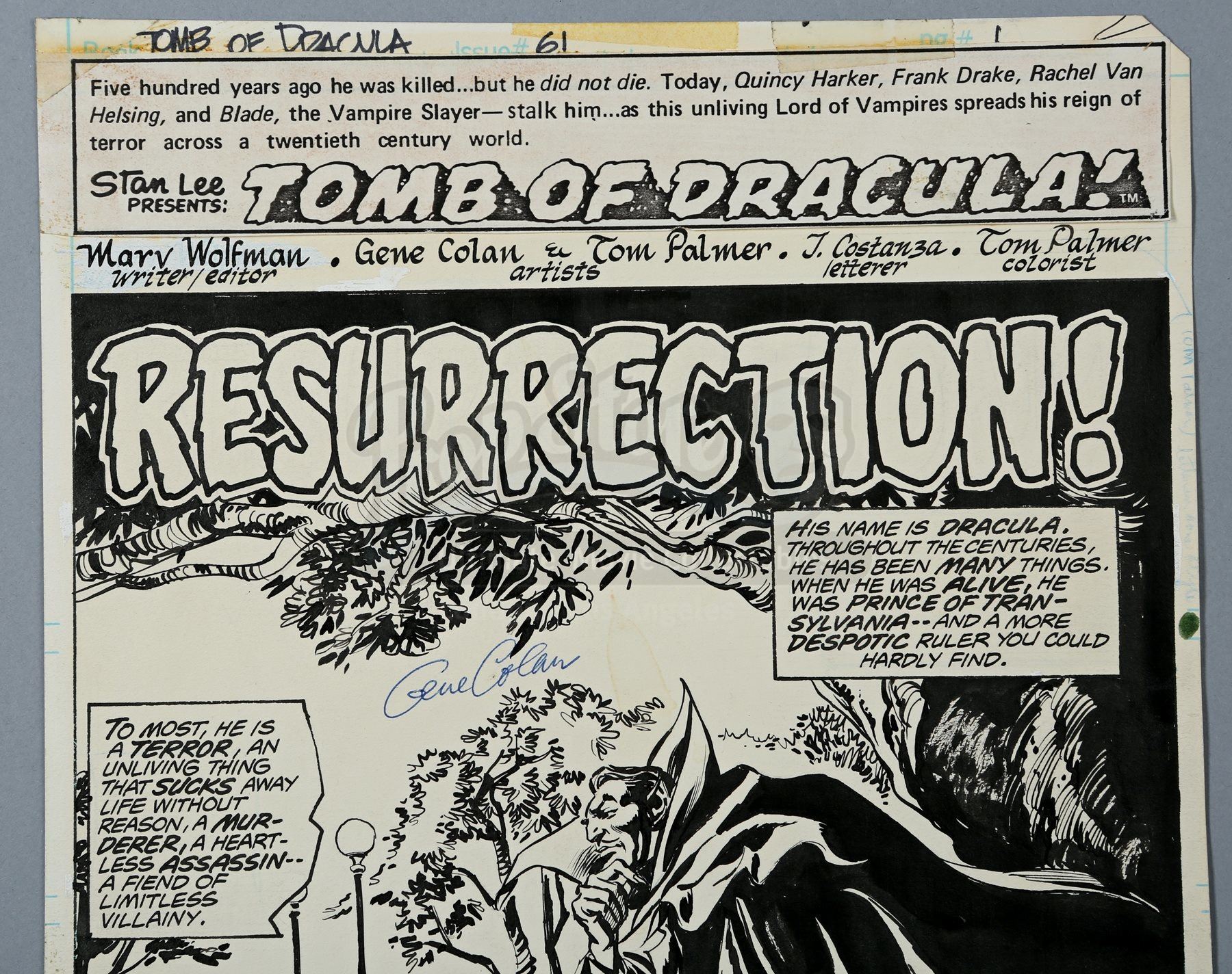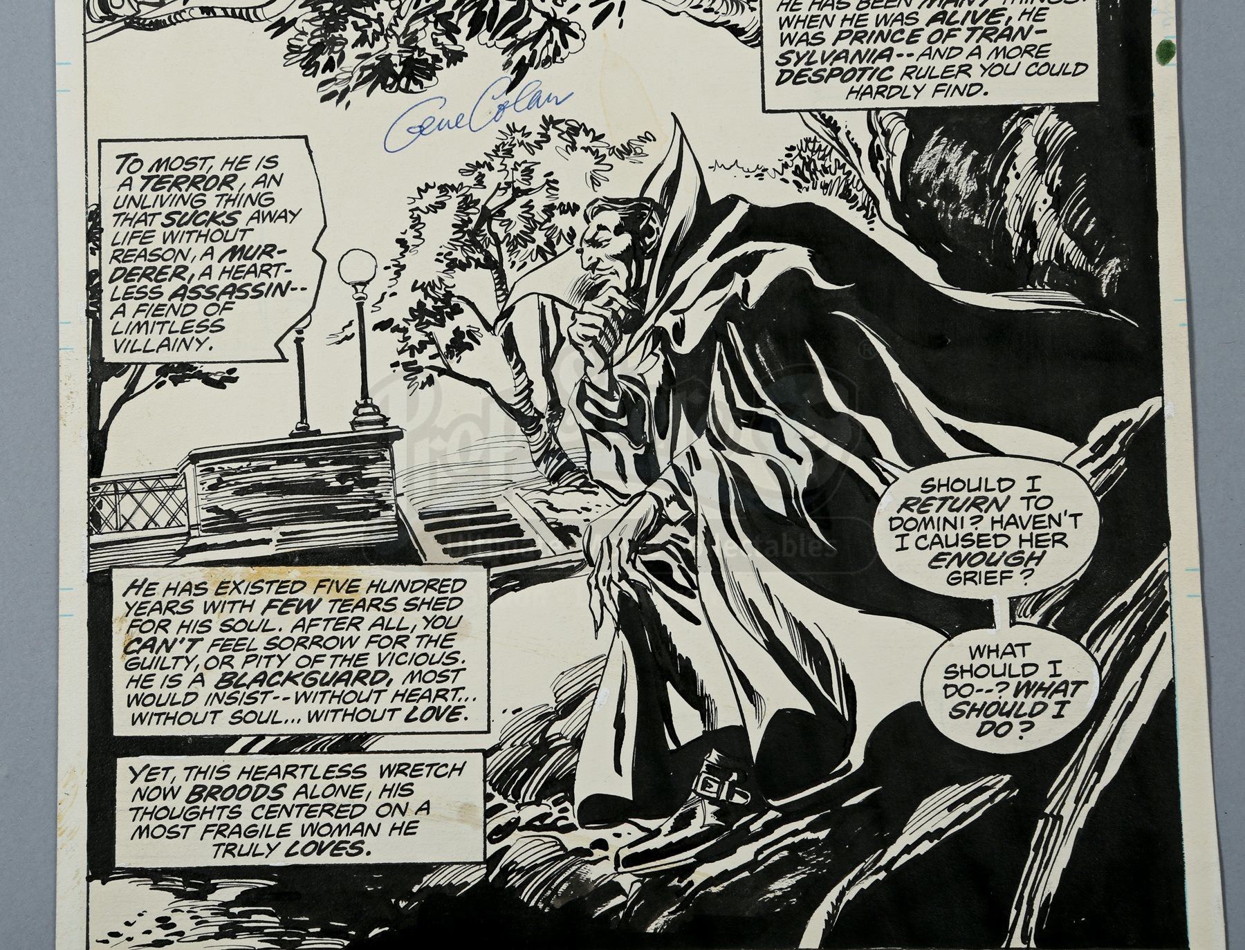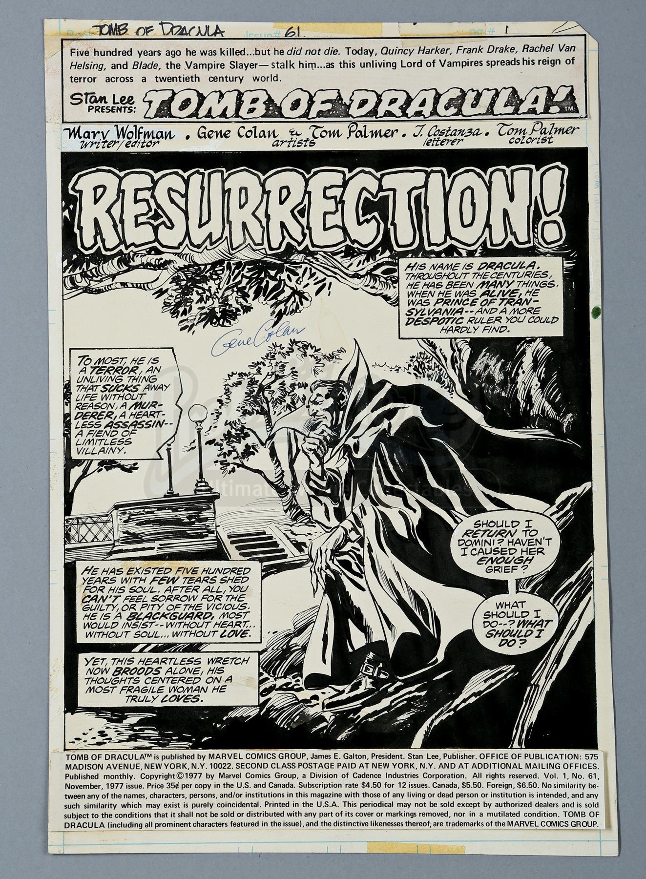 This original pencilled-and-inked artwork is drawn on Bristol board by penciller Gene Colan and inker Tom Palmer. The splash page shows Dracula pondering if he should return to Domini. The title art is pasted to the top of the sheet, while an indicia with publishing information is pasted to the bottom. Handwritten at the top of the sheet is “Tomb of Dracula” and “61”. The piece is signed by Gene Colan in blue ink. On the back of the artwork is a Marvel Comics Group stamp.