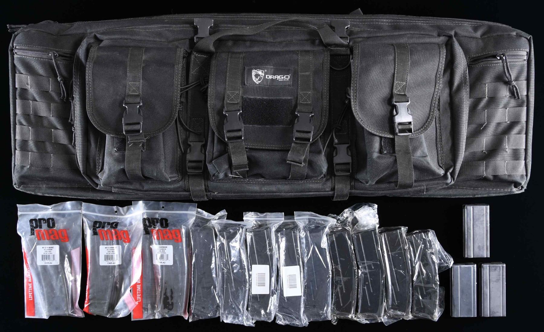 MAGAZINES. Drago soft case containing 15 assorted M1 Carbine mags., including: 1) 3 aftermarket 15-rd. mags. 2) 12 aftermarket 30-rd. mags. CONDITION: case is good, showing some light wear from use. mags. are good go excellent, with 30-rd. mags. remaining in their original factory packaging. (02-23925/MLW). $100-300.
