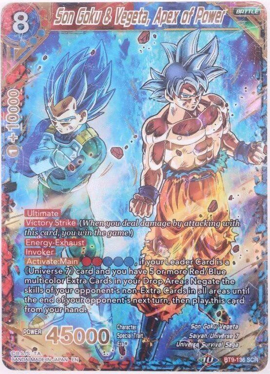 Dragonball Z Trading Card Game SIngle Card of Son Goku & Vegeta Apex of Power with gilded gold foil edges as well as a borderless foil treatment for the background.