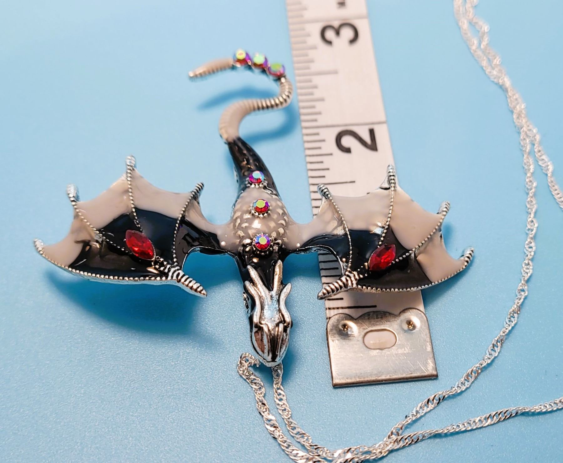 WAVE CHAIN, DRAGON IS BLACK AND GREY ENAMEL WITH RED CRYSTALS ON THE WINGS AND RAINBOW CRYSTALS DOWN THE BACK AND TAIL. JEWELLERY