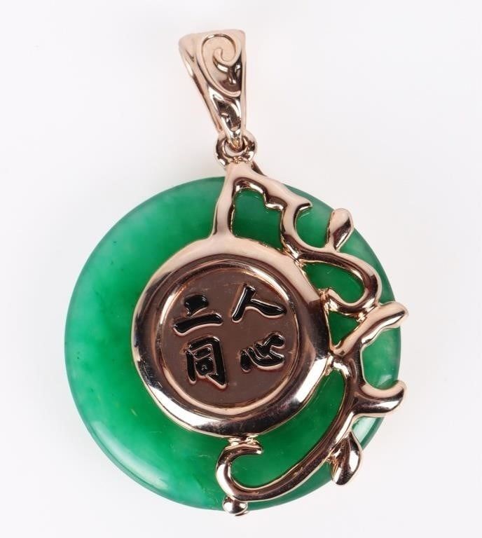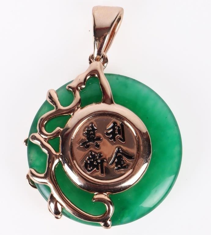 Dragon Fortune green jade white gold plated unisex pendant to include a unique gold plated filigree across one side of the pendant.