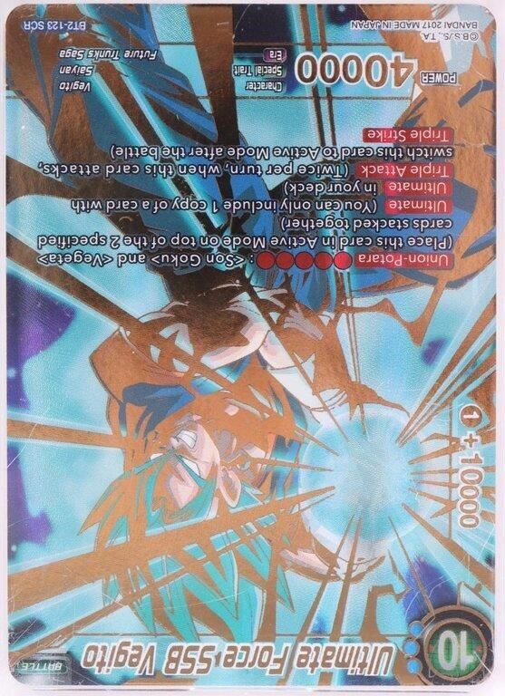 Dragonball Super Trading Card Game Sceret Rare Ultimate Force SSB Vegito featured with gilded foil treatent as well as a foil borderless treatment.