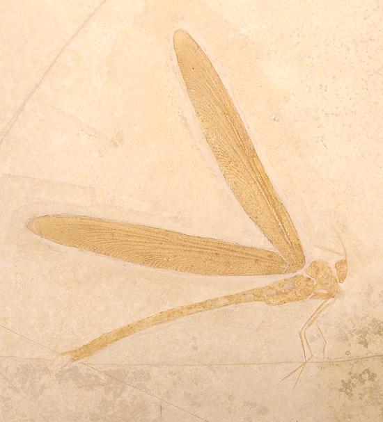 DRAGONFLY FROM SOLNHOFEN. Solnhofen Germany is well known for having the first bird found in the fossil record, Archaeopterix but one of its other famous and popular fossils is the dragonfly. These 150 million year old dragonflies are beautifully preserved in the fine grain lithographic limestone matrix. This rare species Protolindenia wittei is one of the largest and most dramatic. Perfectly positioned on a 7.5 X 6.5 inch limestone matrix, this huge dragonfly has a 4 inch long body and each wing is 3 inches long. The head, antennae, three legs, body ending in two hooks, and amazing wing detail where even the most delicate wing membranes are preserved make this dragonfly one of the finest to be found from the famous lithographic limestone quarry of Solnhofen.