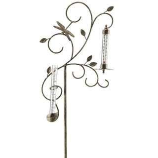 39.5"H X 11.5"W X 2"D - IRON & GLASS DRAGONFLY RAIN GAUGE & THERMOMETER GARDEN STAKE