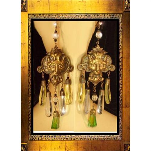 Bring out the charm of the gothic or renaissance with these FABULOUS VINTAGE 5 1/2? long shoulder duster glass and brass earrings. The fierce horned god ( possibly Bacchus with horns) protects these old and wonderful fully faceted Czech glass drops that measure almost 1 1/2? long EACH. Margarita ( our mannequin) is full size so you can see how large these are and how WONDERFUL they look on! The tops of the earrings have bright rhinestones which sparkle and bring attention to the exotic nature of these lovely and mystical earrings. These are in great condition and are so much nicer in person. Buy them quick because I think Margarita is taking a real fancy to them!