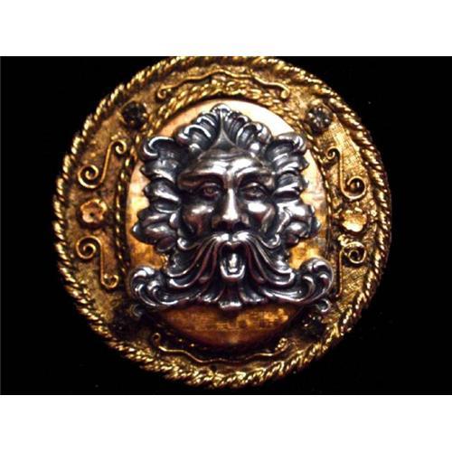 Wow! This locket is one amazing heavy and well made piece!! IT is mixed metal and it has four smoky rhinestone in each corner which adds to the mysticism of this romantic vintage piece. The locket is hidden behind the green man?s head which is riveted to the top of the locket. There is ornate Etruscan metal work around the larger frame. This is not a small piece. It measures 2 ¾" WIDE and is not only a brooch but a pendant. I will also include an newer chain to go with it if you remind if you but it . This is in GREAT shape and is one of the most stunning lockets I have seen. It is a MUST have!
