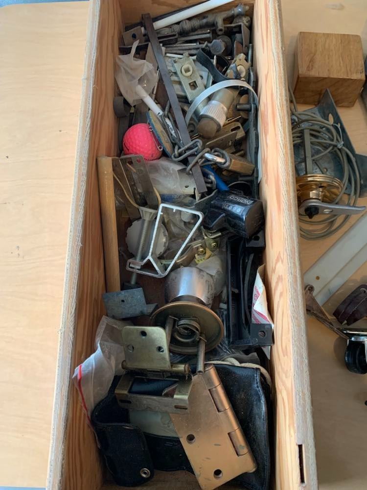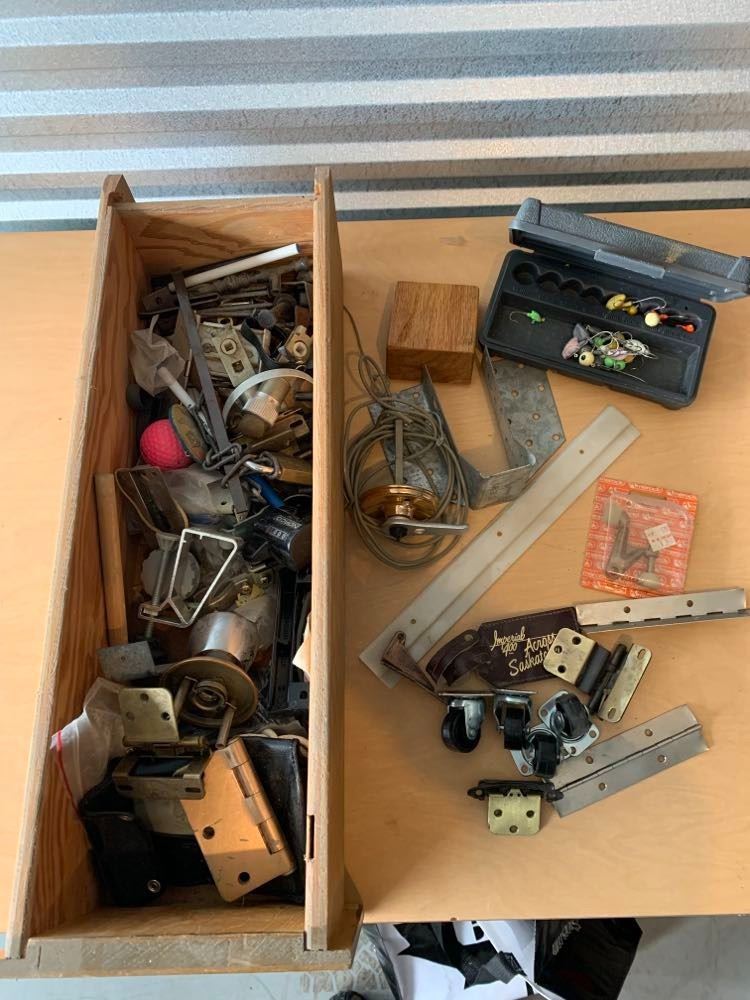 DRAWER FULL OF HINGES, DOOR HANDLES, BRACKETS, BOX OF FISHING LURES, WEIGHTS