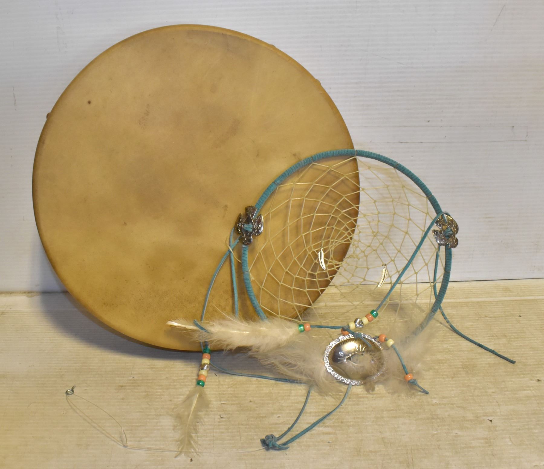 DREAM CATCHER AND 14" DIAMETER HAND DRUM WITH STRETCHED RAW HIDE AND TIES ON THE BACK