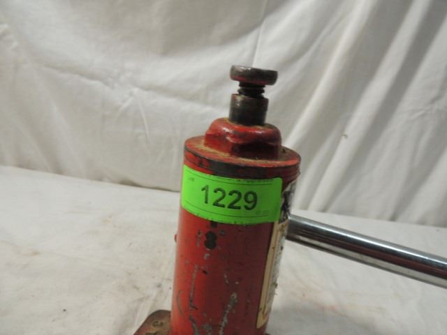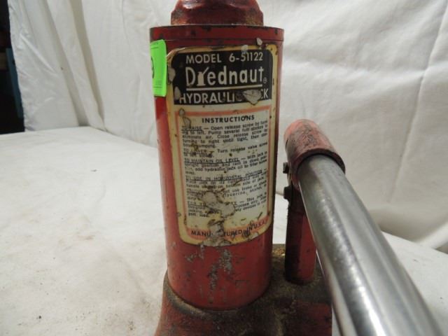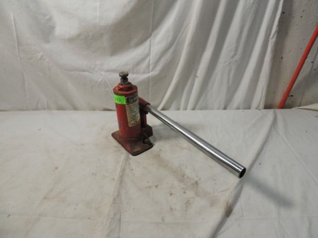 NICE HEAVY DUTY HYDRAULIC BOTTLE JACK IN GREAT SHAPE, COMPLETE WITH HANDLE, AS SHOWN.