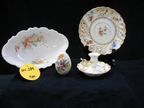 DRESDEN ASST INCLUDES (1) 7 1/4in X 4 1/8in OVAL DISH STAMPED DRESDEN GERMANY FLORAL ROSES W/EDGE RELIER (MFG FLAW) EXCELLENT, (1) 4 3/4in SWIRL BOWL HND PTD STAMPED R K DRESDEN GERMANY 89/3 EXCELLENT, (1) PETITE SINGLE CANDLE HOLDER STAMPED R.K. DRESDEN G