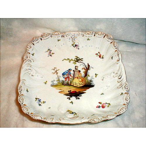 THIS IS A BEAUTIFUL VINTAGE DRESDEN BOWL WITH A COURTING SCENE AS THE CENTER PIECE. THIS BOWL MEASURES 2 IN. TALL AND 9 IN. BY 9 IN. SQUARE AND IS IN VERY GOOD CONDITION WITH NO CHIPS, CRACKS, OR REPAIRS.