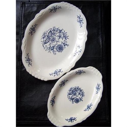 Vintage DRESDEN - Imperial Blue Dinnerware Platters - made in the USA - Homer Laughlin China co. In very good condition. 2 Platters one Large & one Small. Blue Flower Design. Large Platter measures: 11 3/4" across x 8 3/4" tall x 1 1/4" deep. There is a small chip on underside edge of large platter (see photo). The smaller platter is 9 1/4" across x 6 1/4" high x 1" deep. Both Platter have a nice glaze, no crazing, no cracks!