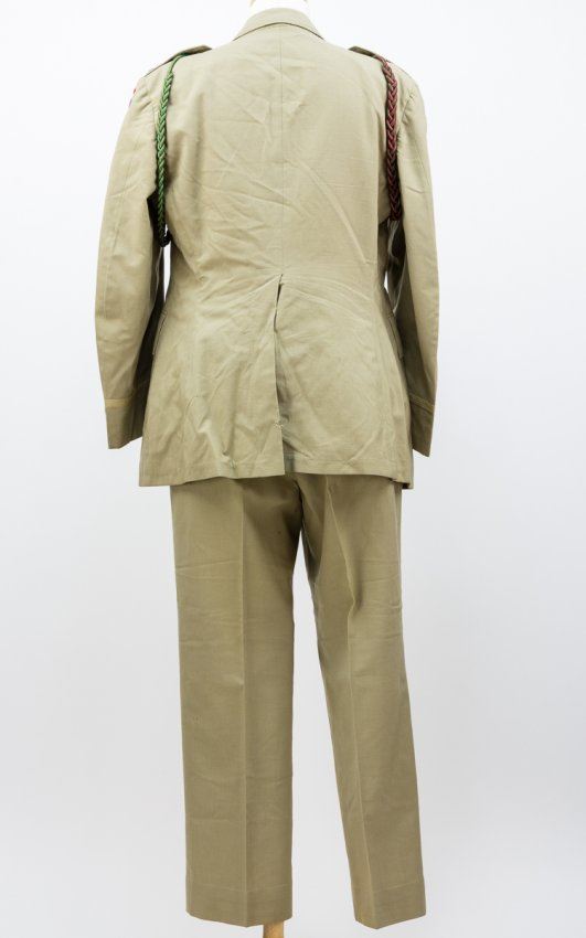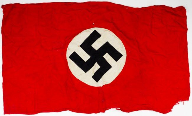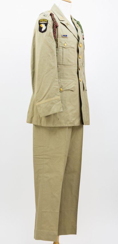 WILLIAM W. WEBB (1914-1984) American Army officer, a captain with the 327th G.I.R., 101st Airborne, a North Carolinian who enlisted on August 27, 1941 and remained with the 101st for the duration of the war, until Jan. 6, 1946. Present is Webb's summer uniform with captain's shoulder insignia, two-piece 101st Airborne insignia sewn to right shoulder, with an Army Service Forces patch applied to the left shoulder. Webb's parachutist's badge is pinned above his Combat Infantryman's Badge, which itself surmounts service ribbons including one for a Bronze Star and European Campaign with three battle stars and a beach landing arrowhead (Utah Beach). The uniform also bears a badge showing award of the Presidential Unit Citation with Oak Leaf, and two lanyards. Webb's matching uniform trousers are also present, as is one of his parachutist's boots (right) and an Army regulation rip cord he kept as a souvenir. Also present is a 44" x 26" N.S.D.A.P. flag, possibly a vehicle or position marker flag with no attachments for hoisting, made of separate white and black sections on a red field. This was displayed with one face up, as a crude repair has been made to a tear on the reverse. This flag was found among Webb's possessions and was likely captured by Webb or his comrades in the 327th G.I.R. A corner of the flag has been cut away, probably by a soldier souvenir hunter. A very few tiny moth nips to the uniform which is otherwise fine. The 327th Glider Infantry Regiment ("Bastogne Bulldogs") entered the theater of war when it landed by sea on Utah Beach on June 7, 1944, because of a shortage of glider tow planes, though some elements did reach shore on D-Day. The 327th suffered heavy casualties while advancing on Carentan, and played a pivotal role in taking the peninsula. Indeed, the 527th was likely the first unit of the Utah Beachhead to link up with the Omaha Beachhead. The regiment played a pivotal role in Operation Market Garden battle near Best, in the Netherlands, encircling a large German force which had been pressured from the west by the tank-supported 502nd of the 101st.though some companies suffered two-thirds casualty rates. At Bastogne, the 327 held half of the perimeter until they were finally relieved.