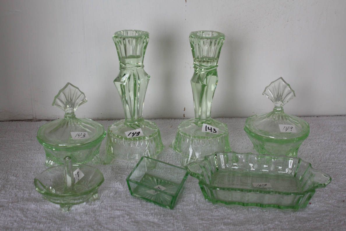 DRESSER SET (GREEN GLASS PROBABLY DEPRESSION ERA)