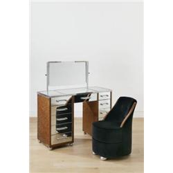 <b>Description: </b>birds eye maple, chrome-plated metal, mirrored glass, the chair upholstered in black silk velvet, the dressing table stamped on the back "dÉposÉ made in France Desny Paris"chair: 28 3/8 in. (72.5 cm) highcoiffeuse: 45 3/4 x 41 1/8 x 17 in. (117.2 x 105.5 x 43.7 cm)