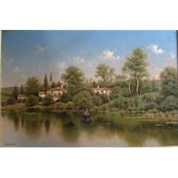 DREW, George W., 1875-1968. "Fishing from a Boat with a Town View Behind". Huile sur toile, signée. École américaine. Oil on canvas, signed. American School. 24" x 36" - 61cm x 91.4cm. $3000/4000