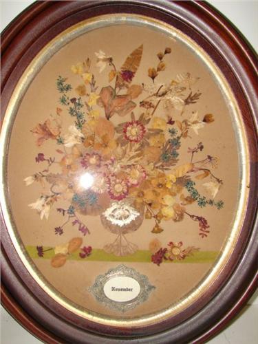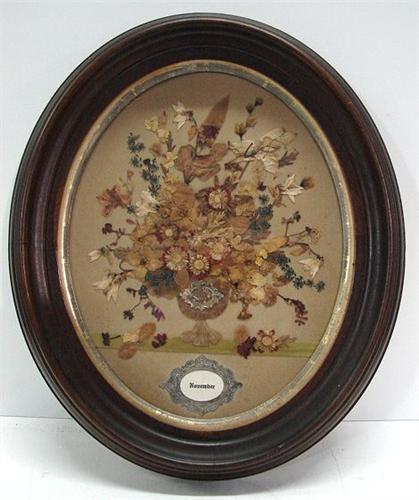 FRAMED PRINT OF DRIED FLORAL BOUQUET. Marked on bottom “November”. Rests in oval walnut frame. 16.25” x 19.25” framed.