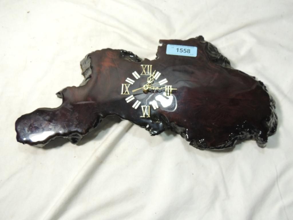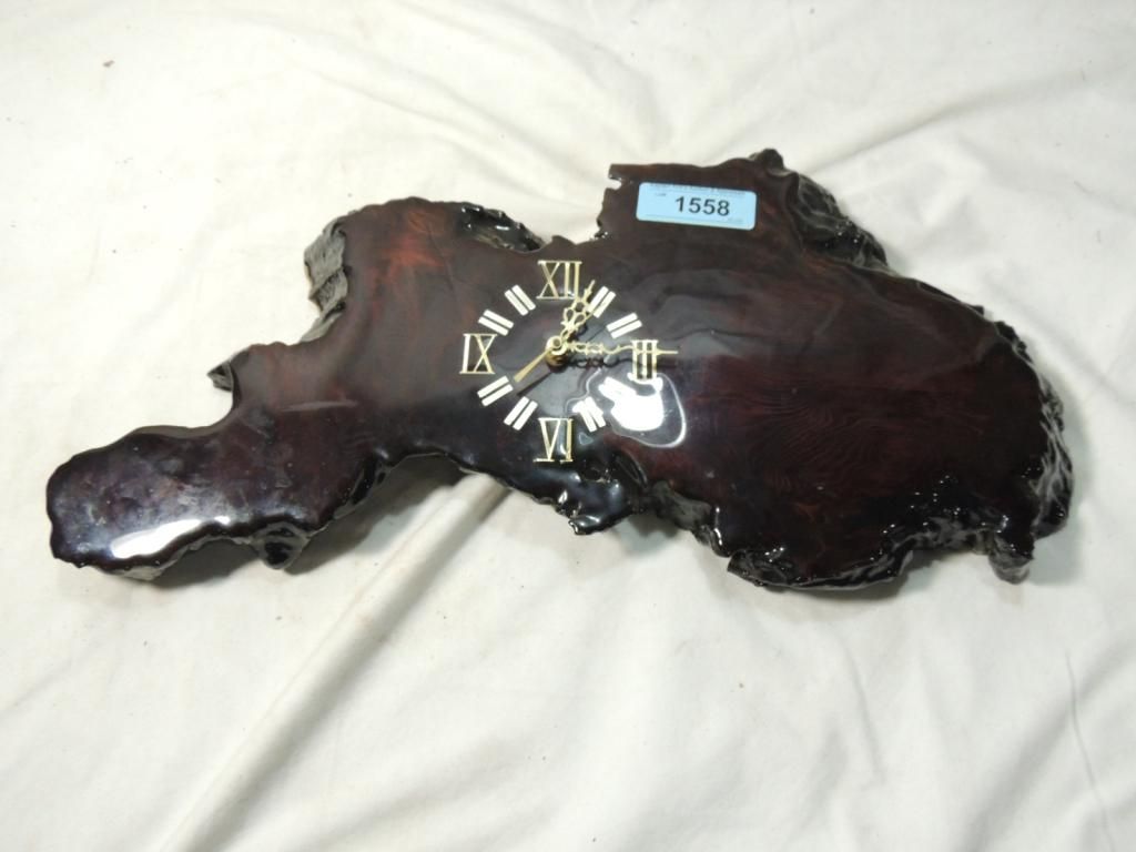 DRIFT WOOD POLISHED WALL CLOCK. COLLECTIBLE AS SHOWN SEE PHOTO FOR MORE DETAILS.