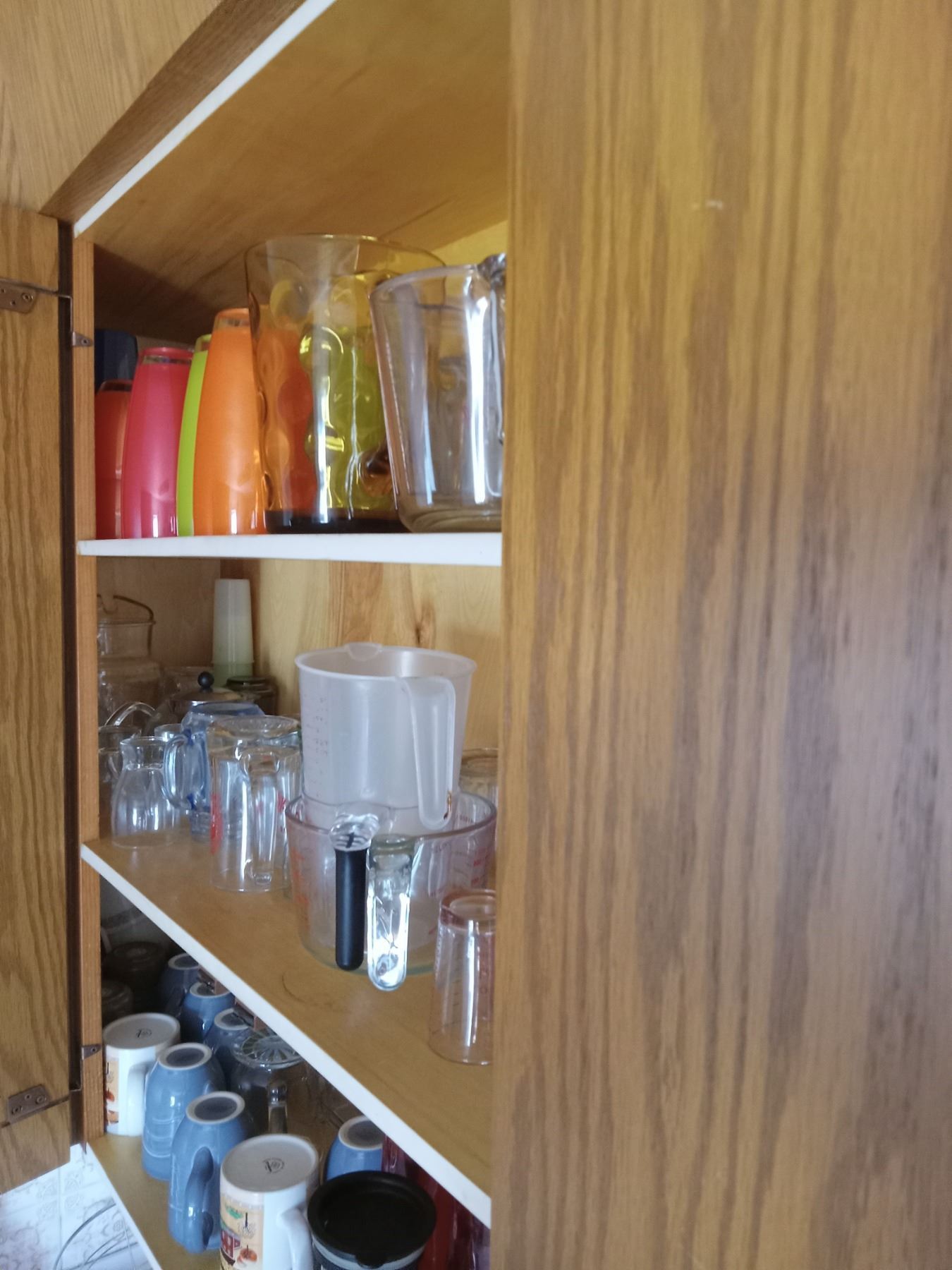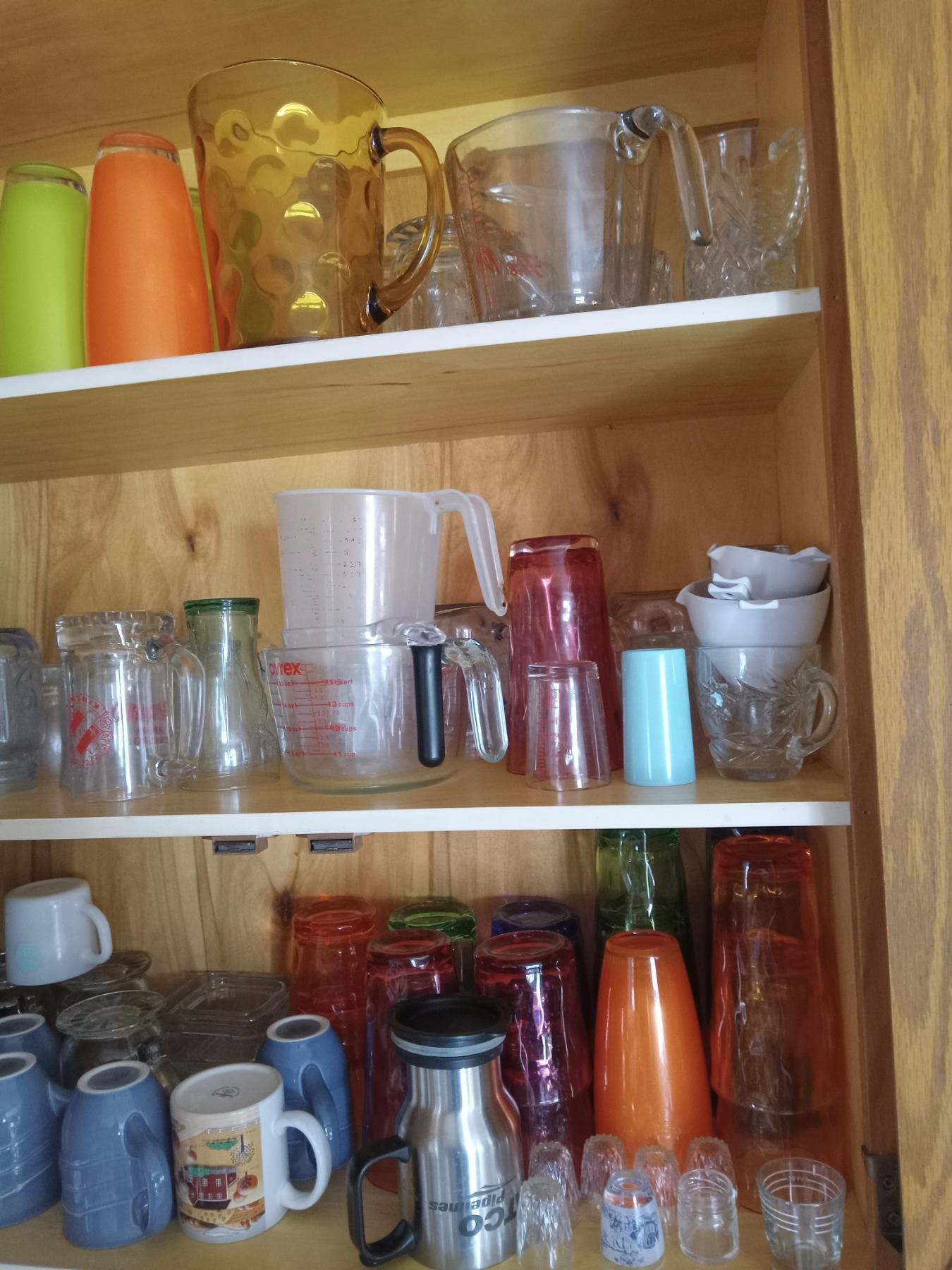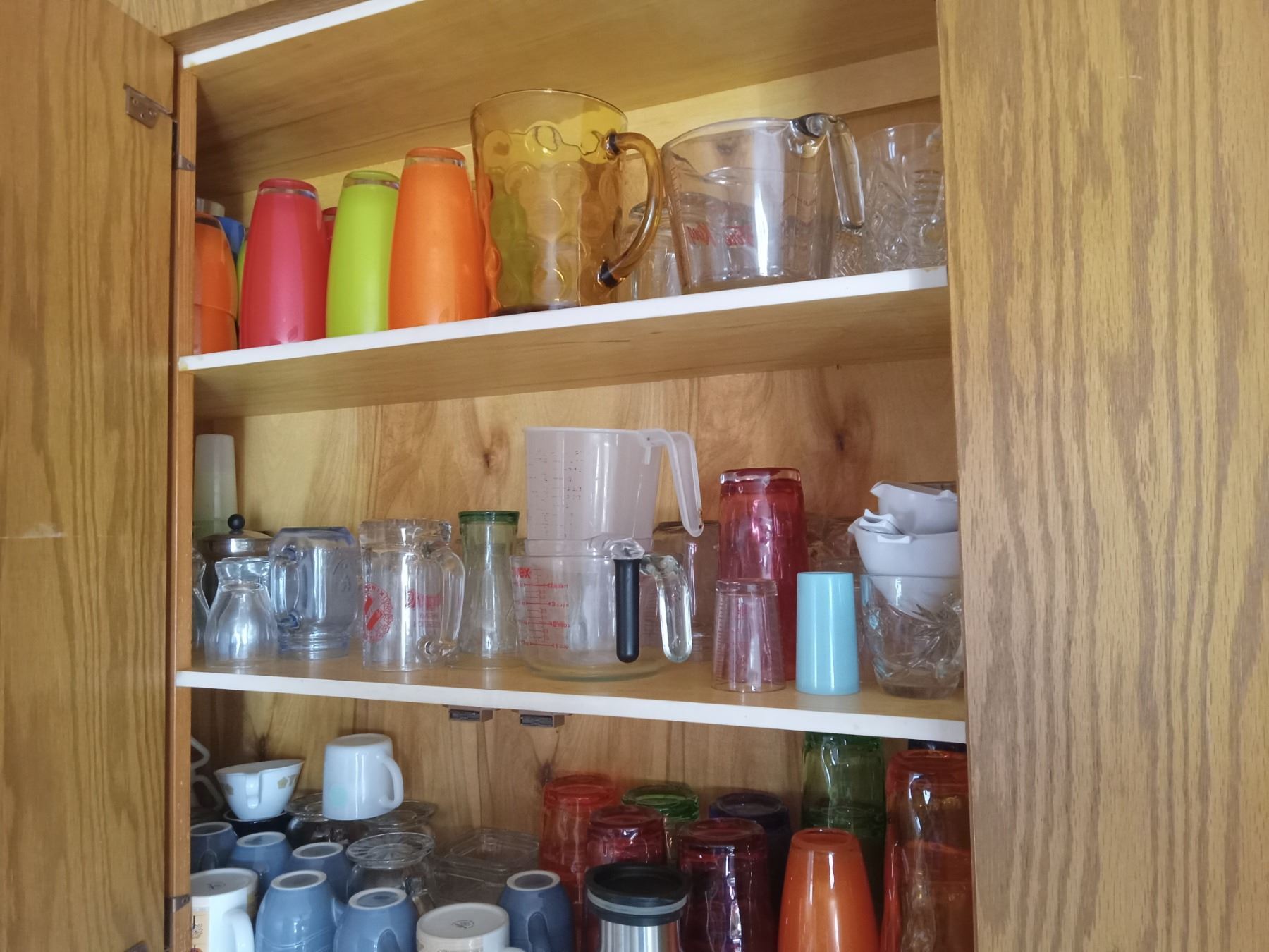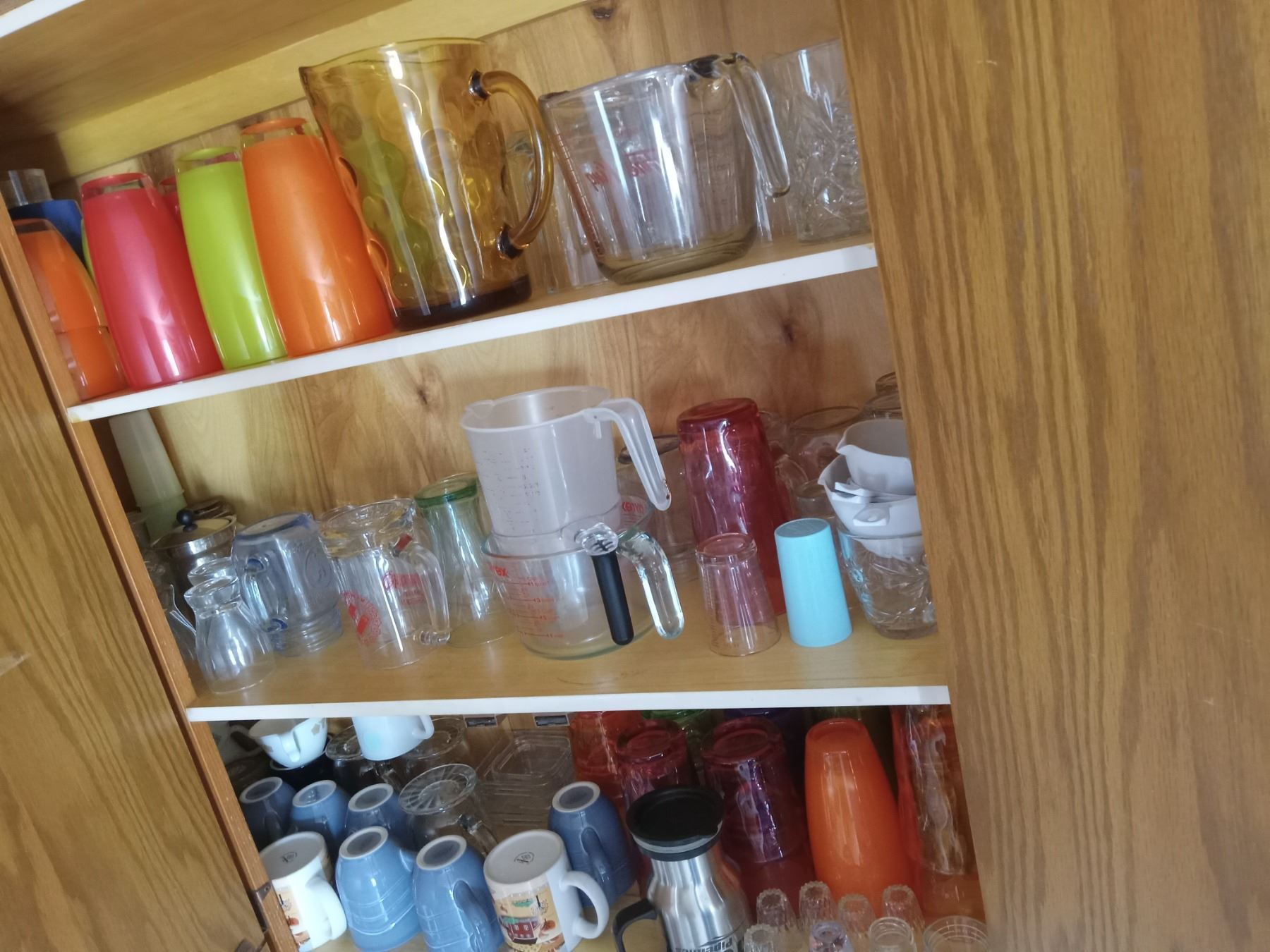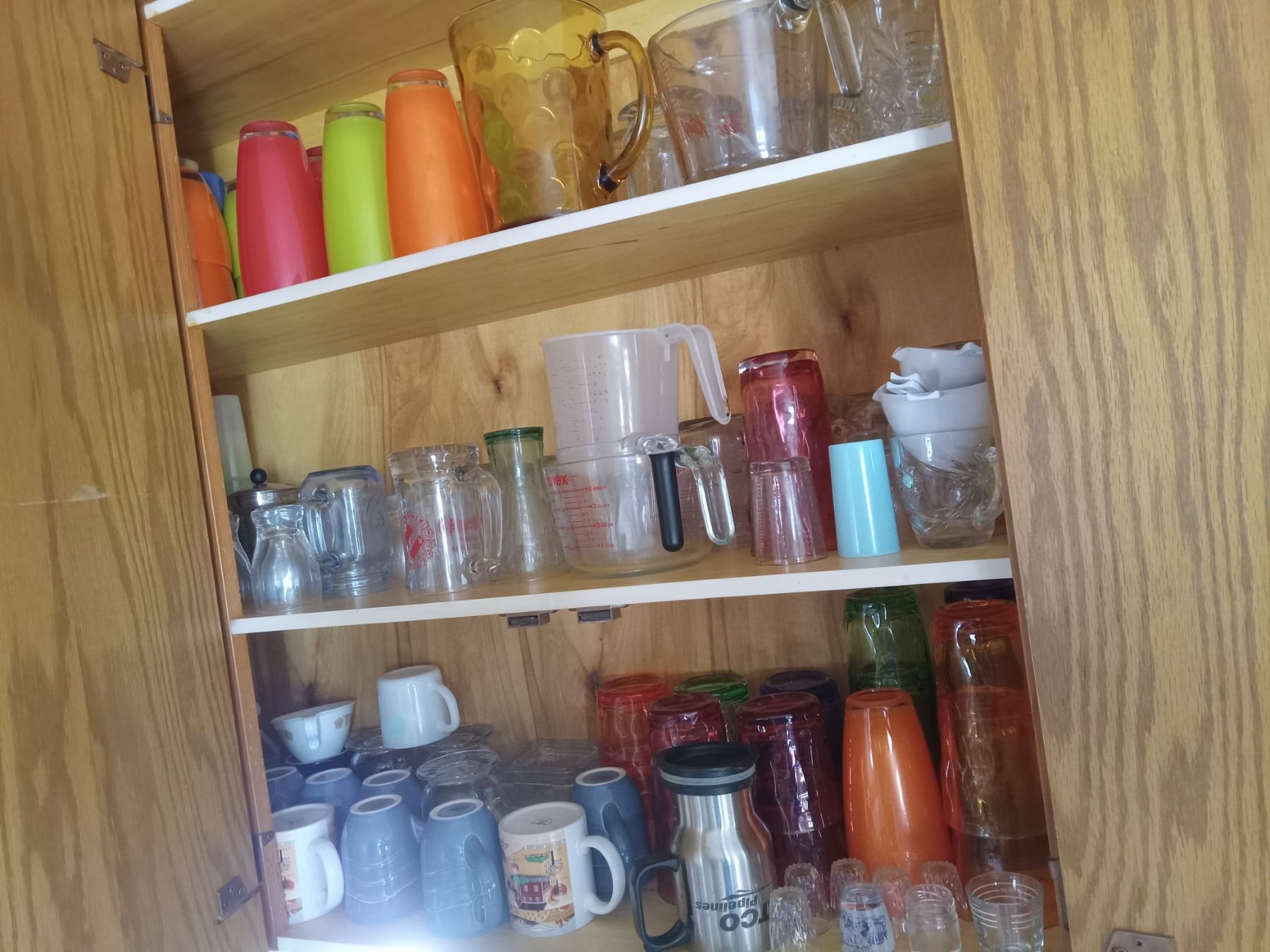 DRINK AND COFFEE CUPS, GLASSES AND ALL CONTENT IN CUPBOARD