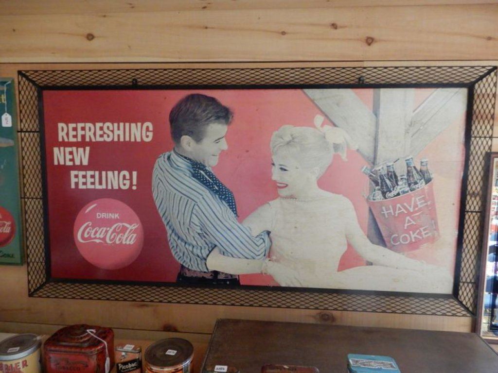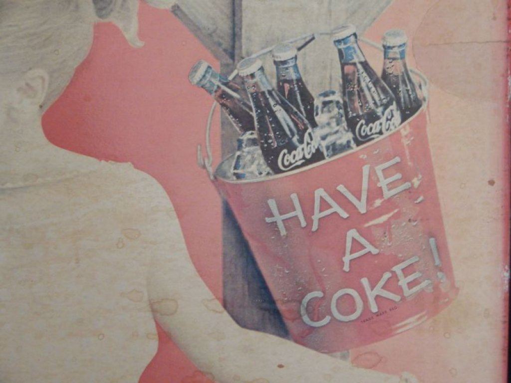 DRINK COCA-COLA FRAMED CARDBOARD ADVERTISEMENT REFRESHING NEW FEELING - 16 1/4" X 30 1/4" - SOME WATER DAMAGE & WEAR LOCATION: UPPER BACKROOM