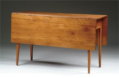 DROP LEAF HEPPLEWHITE DINING TABLE. Four tapered square legs, two of which swing out to support leaves. SIZE: 28in. h x 16in. w x 47in. (open) x 48in. d. CONDITION: Refinished. Top has been reset. Otherwise good. 9-26026