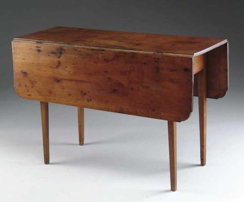 DROP LEAF HEPPLEWHITE TABLE. The rectangular leaves with ovolu cut corners, square tapered legs and molded edge skirt. Four legs, two of which swing to support leaves. SIZE: 28” h x 42-1/4” d x 15” (closed); 40” (open). CONDITION: Some stains and uneven finish, chips to bottom of legs. Otherwise good. 9-27787