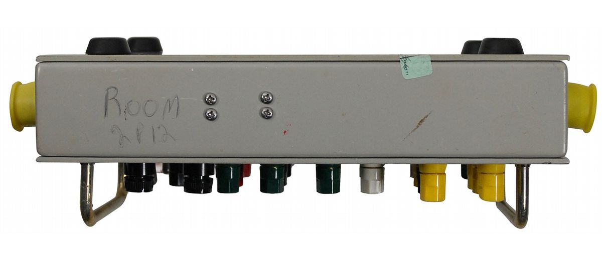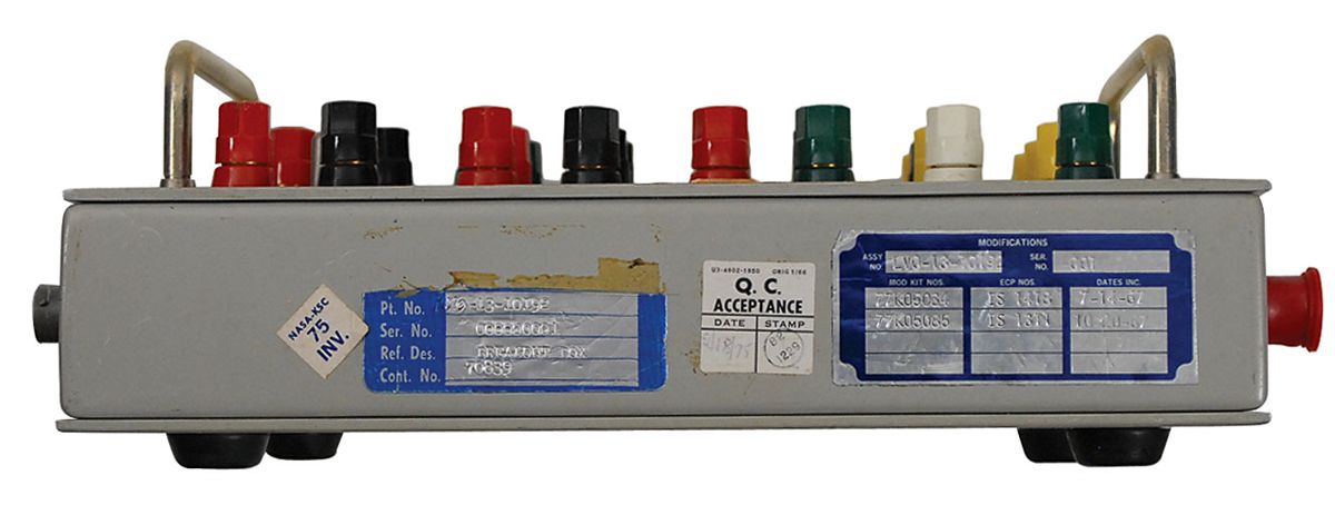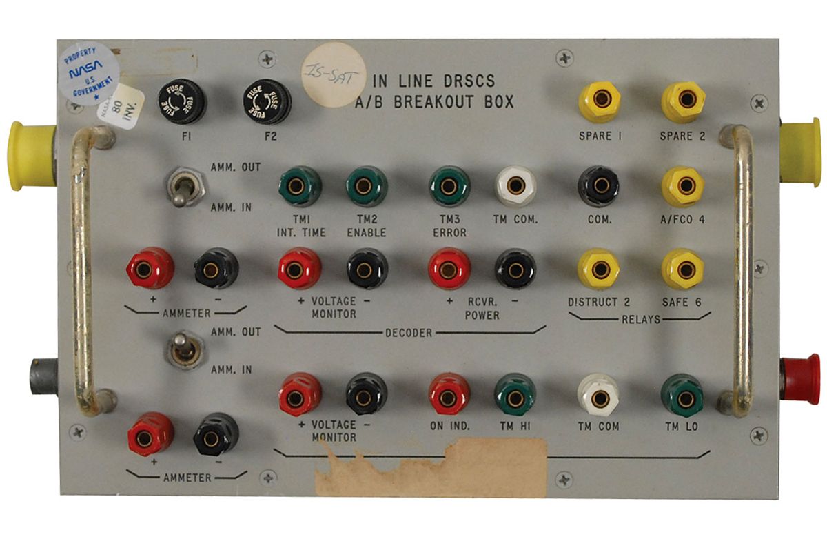 An In Line DRSCS A/B Breakout Box. This Digital Range Safety Command System box measuring 11 x 7 x 2.5, with multiple connections, including one labeled “Destruct 2.” Box retains its original manufacturer’s label, as well as an additional modification label, and a quality control label dated February 18, 1975. In fine condition.