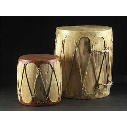 DRUMS: Two wood-frame pendant drums with hide heads and laces, unadorned. 20th c.