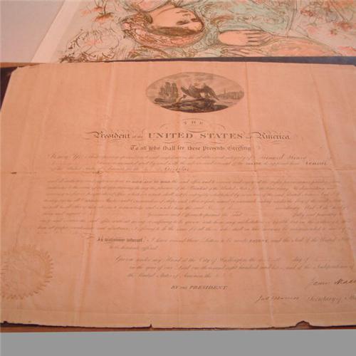 DS signed by Madison as president and by "Jas. Monroe" as secretary of state, one page, 21.5 x 17.5, January 16, 1816. Bernard Henry is appointed the US consul to Gibraltar. Some paper loss to the corners and bottom edge, several fold intersection holes repaired with clear tape on the reverse, and scattered light staining, otherwise very good condition, with the embossed paper seal intact. Certificate of authenticity from R & R Enterprises. min bid 1,500