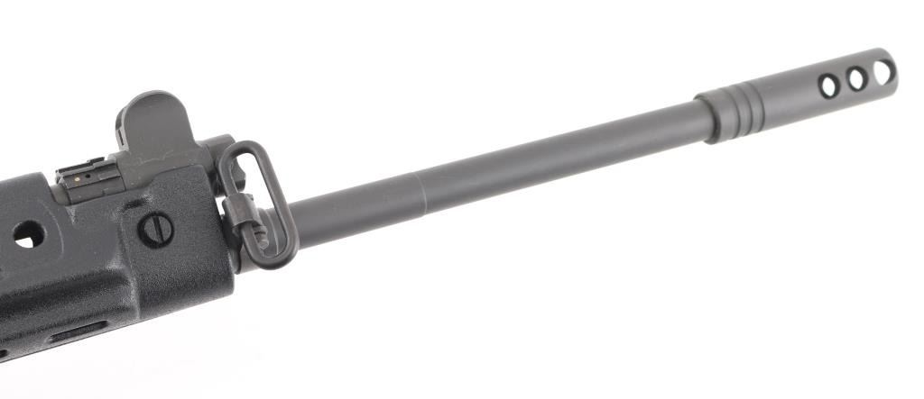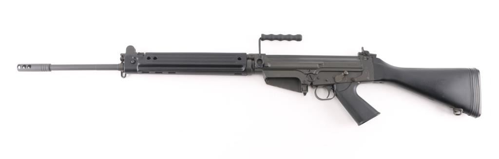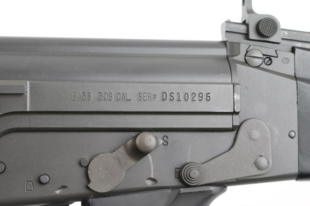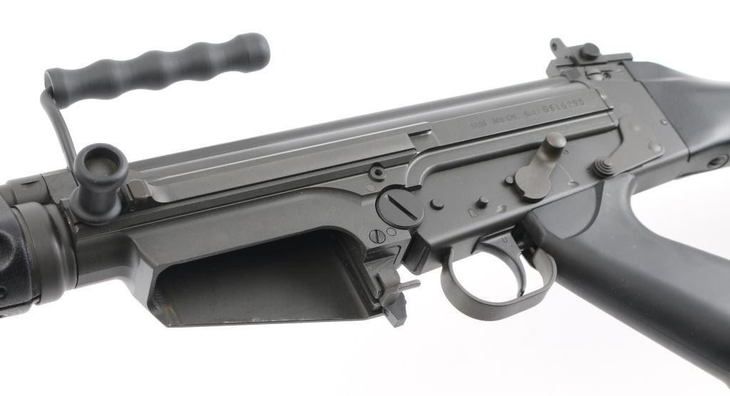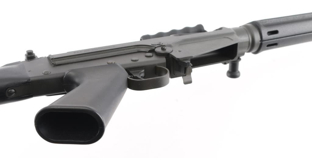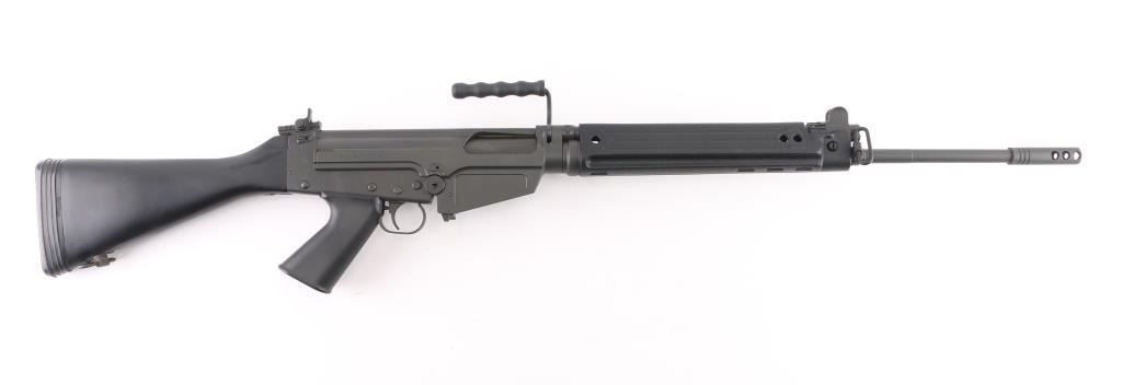 Semiautomatic rifle based on the FN FAL, made in the USA. Features dark gray parkerized finish, black polymer furniture, 20" chrome lined barrel, muzzle brake, protected post elevation adjustable front sight, windage adjustable peep rear sight, folding carry handle, manual safety, sling swivels, adjustable gas system. Metric type receiver with lightening cuts, accepts metric FAL magazines (none provided). Bore is pristine. Retains 95% finish with handling marks. Polymer shows few with minor blemishes. No magazine. Condition is NRA Excellent *** Modern Firearm ***