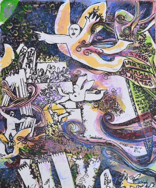 DUBI ARIE **VICTORY** ETCHING & PASTEL. Artist: Dubi Arie - Title: Victory - Medium: Etching and Pastel on Paper - Signature: Hand-signed by the Artist - Image Size: Approximately 12 inches x 10 inches - Details: This work comes with a Certificate of Authenticity - Edition: 72 - Biography: It was during the final bursts of gunfire of the bloody Six Day War. Twenty-eight-year-old paratrooper Dubi Arie gazed at the wondrous sight before him. An overwhelming feeling rose up from deep within him -- a personal awakening that resulted from his life-long quest to understand the struggles of the Jewish people. Although it would be several more years before he would finally put brush to canvas, the mission of Dubi Arie -- artist, soldier, farmer and holocaust survivor -- had already begun. Deeply aroused by his experiences in the Six Day War, Dubi embarked on a massive artistic project that he perceived as a "national mission", a major contribution to his people that would require total concentration and devotion in the years to come. To gain perspective on his life and subject matter, the artist and his family moved to Toronto, Canada in 1974, where he was able to fulfill his dream of creation. Dubi, the former commando, who had once operated with an army and nation behind him, now operated alone -- on a one-man mission. - SPECIAL NOTE: DUBI ARIE'S ORIGINALS HAVE SOLD FOR MORE THAN $2.5 MILLION. HIS ORIGINAL ENTITLED "THE MISSION" IS HANGING IN THE HOLOCAUST MUSEUM. - Warranty: Item GUARANTEED to be as described