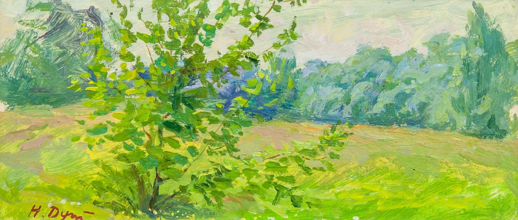 Oil on board, landscape scene. Signed by artist on the lower left corner, Dubina Nikolay Alekseevich (Ukrainian, 1939-1994). 3.34 x 7/68 inch (8.5 x 19.5 cm). The artist Dubina Nikolay Alekseevich (1939-1994). The Ukrainian painter. Was born in 1939 Krasnoarmeysk, Donetsk area. Dubina attended the Dnepropetrovsk art school (1966) and the Kiev art institute (1972). Studied with V.Gurin, A. Plamenitsky, V.Vyrodovoj. He is a listed artist and a member of the Union of artists of the USSR since 1984. Personal exhibitions include the following: 1989, 1995 (Donetsk). He is also the winner of the regional award of A.Kuindzhi (awarded posthumously, 1995). Works are stored in Donetsk an art museum, private collections of Ukraine and other countries. He is also listed within the literature, "A Dictionary of Twentieth Century Russian and Soviet Paintings 1900-1980." (Matthew Cullerne Bown, 355). PROVENANCE: Private collection (Kiev, Ukraine)