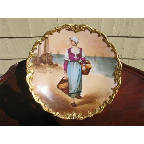 HERE IS A STUNNING HAND PAINTED ARTIST SIGNED LIMOGES PLACQUE OF A WOMAN WALKING ALONG THE SEASHORE BY THE FAMOUS FRENCH STUDIO ARTIST DUBOIS. HE IS PROBABLY THE MOST FAMOUS LIMOGES ARTIST AND IS FEATURED EXTENSIVELY IN MARY FRANK GASTON'S COLLECTOR'S ENCYCLOPEDIA OF LIMOGES (3RD ED.) AND DEBBY DUBAY'S ANTIQUE LIMOGES AT HOME. THE ARTWORK AND COLORS ARE SUPERB AS CAN BE SEEN IN THE IMAGES. NO CHIPS, CRACKS, HAIRLINES OR REPAIRS. FACTORY DRILLED HOLES FOR HANGING ON BACK. MEASURES 10" IN DIAMETER. NO GOLDWEAR/MINT CONDITION. LIMOGES FRANCE MARK 2 IN GREEN UNDERGLAZE AND LAZEYRAS, ROSENFELD AND LEHMAN DECORATING MARK 2 IN GRAY OVERGLAZE.