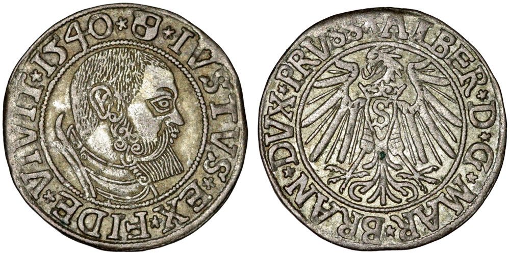 Rev: Arms in center, shield with "S" on a chest (symbolizing initial of polish king Sigismund I to whom duke Albrecht was a Vassal ).