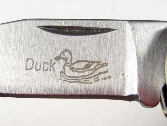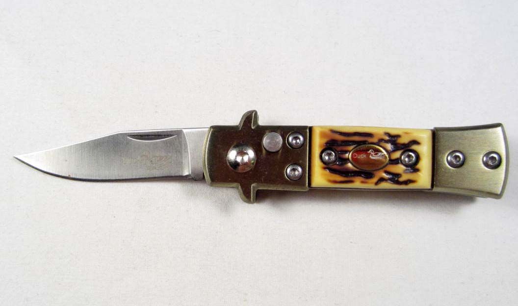 Approx. 4 11/16" w/ the blade open. The blade is marked w/ a swimming duck and has the letters besides the logo. The switch portion works fast.