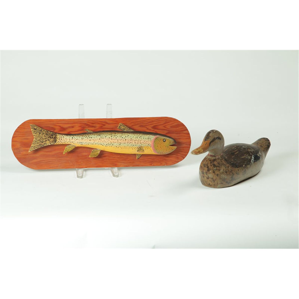American, 20th century, wood. Mallard hen with working repaint and glass eyes. Stamped "Evans Decoy", 17"l., and a folksy rainbow trout on plaque with original paint. Fins have some damage. 22"l. overall.