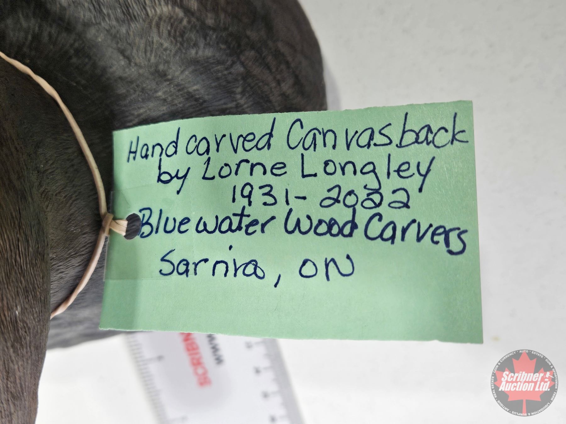 DUCK DECOY : Wooden & Signed (Consignor Tag ~ Handcarved Canvaback by Lorne Longley c.1931-2022 : Bl