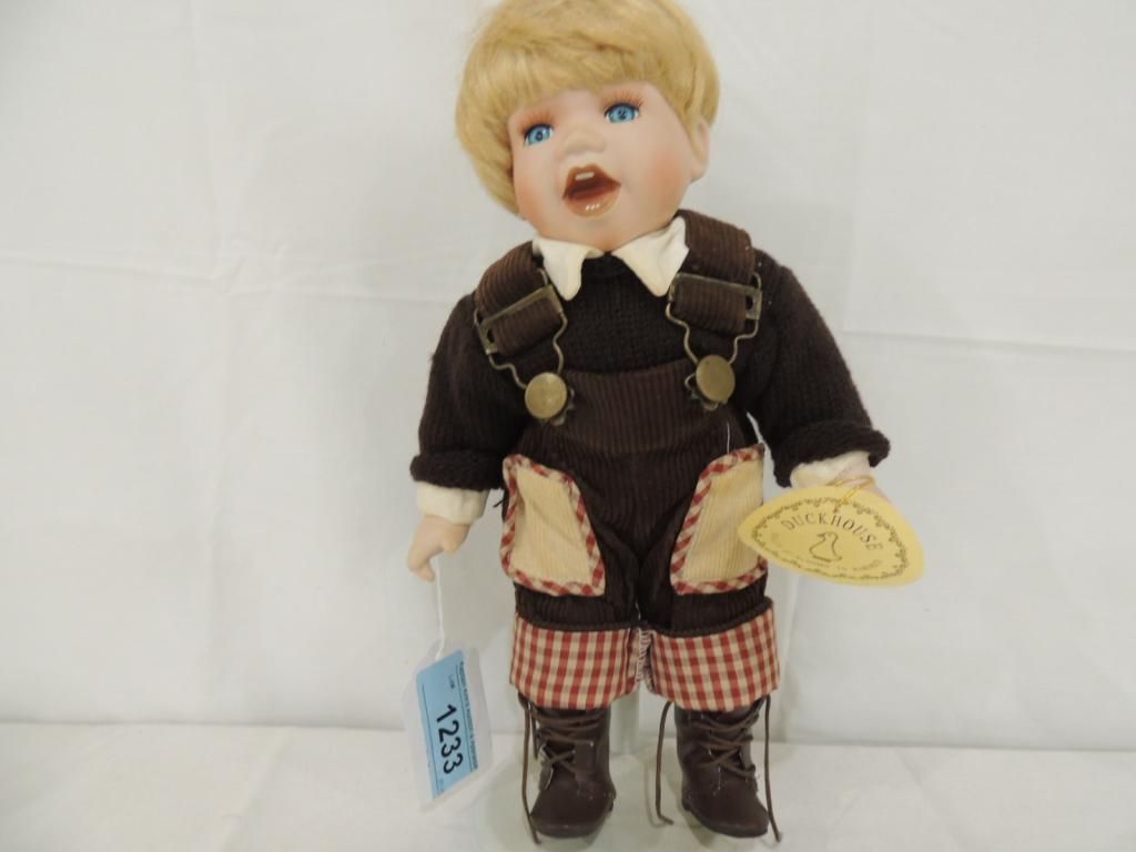 DUCKHOUSE DOLL IN CORDUROY OVERALLS 12" TALL AS SHOWN. SEE PHOTO FOR MORE DETAILS.