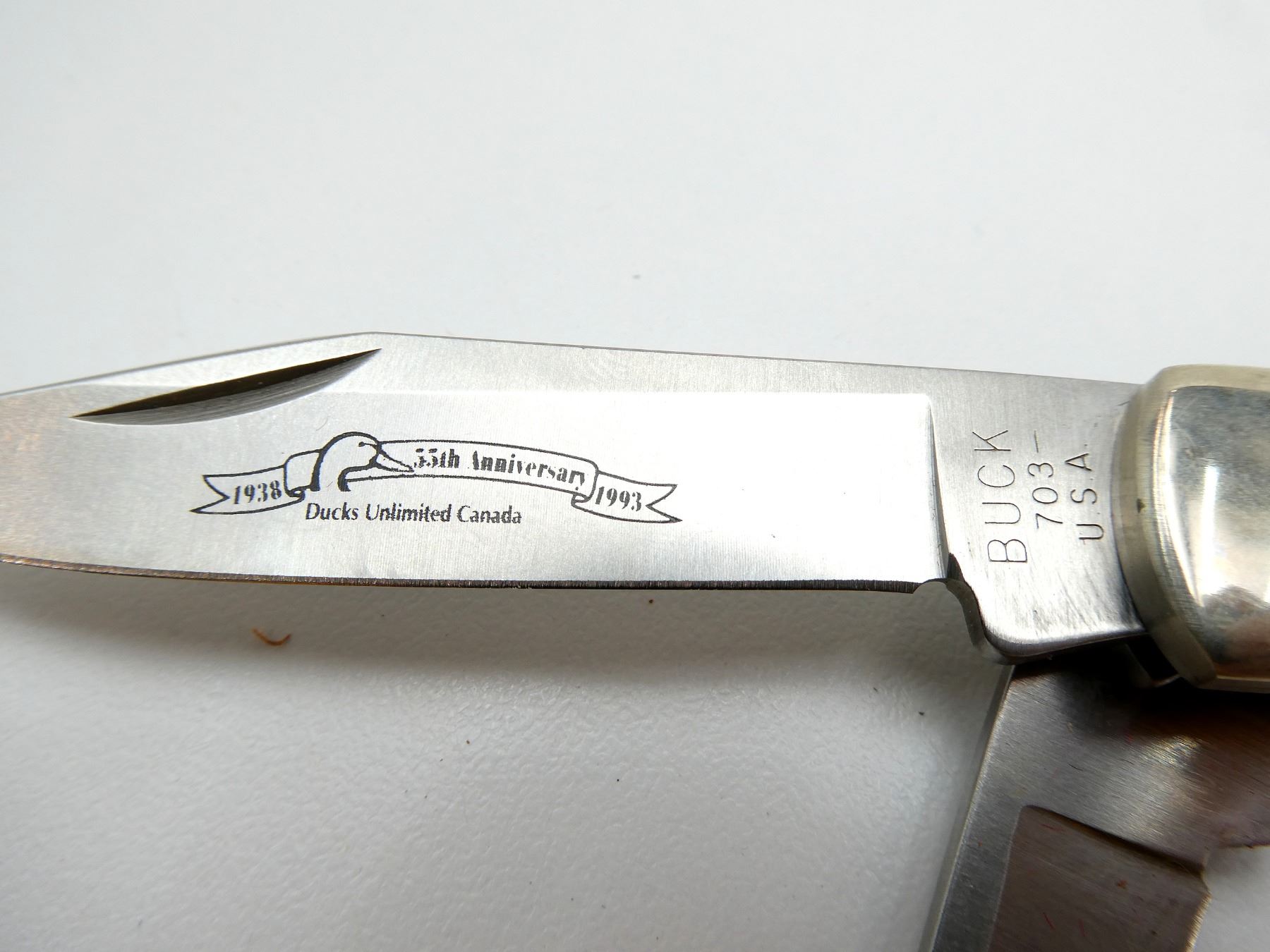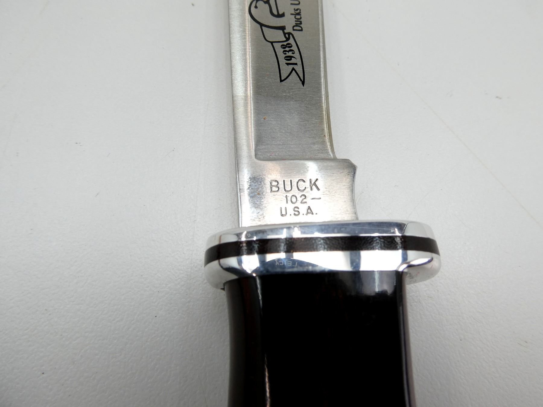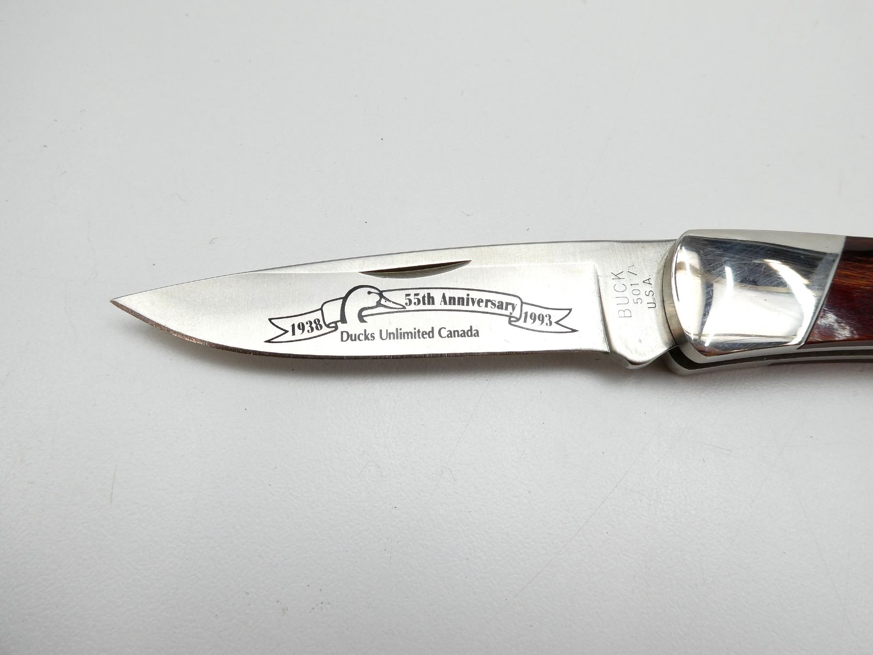 UNDER GLASS, LOT INCLUDES; (1) FIXED BLADE KNIFE, BLADE MARKED: "BUCK, 102-, U.S.A." & "1938", DUCK HEAD, "55TH ANNIVERSARY, 1993" IN BANNER OVER "DUCKS UNLIMITED CANADA", WOOD GRIP WITH DUCK EMBLEM, BLADE APPROX. 4 1/8", OAL APPROX. 8", (1) FOLDING KNIFE, BLADE MARKED: "BUCK, 501 /, U.S.A." & "1938", DUCK HEAD, "55TH ANNIVERSARY, 1993" IN BANNER OVER "DUCKS UNLIMITED CANADA", 2-PIECE WOOD GRIP WITH DUCK EMBLEM, BLADE APPROX. 2 7/8", OAL APPROX. 6.5", (1) 3-BLADE FOLDING KNIFE, LARGEST BLADE MARKED: "BUCK, 703-, U.S.A." & "1938", DUCK HEAD, "55TH ANNIVERSARY, 1993" IN BANNER OVER "DUCKS UNLIMITED CANADA", 2-PIECE WOOD GRIP WITH DUCK EMBLEM, BLADES APPROX. 2.5", 1 78" & 1.75", OAL APPROX. 5.75", (1) TAN LEATHER SHEATH WITH KNIFE SHARPENING TOOL, SHEATH MARKED: "DUCKS, UNLIMITED, GUIDE SERIES", SHARPENING TOOL MARKED: "CHROM-VANADIUM, SOLINGEN-GERMANY", SHEATH OAL APPROX. 7.5" & (1) WOODEN DISPLAY CASE WITH FRAMED GLASS LID, RED FELT LINED, LOCKS, WITH KEY, BRASS LATCH, APPROX. 12" X 9 3/8" X 1 7/8". SEE PHOTOS. *NO GUARANTEE ON GLASS FOR SHIPPING*