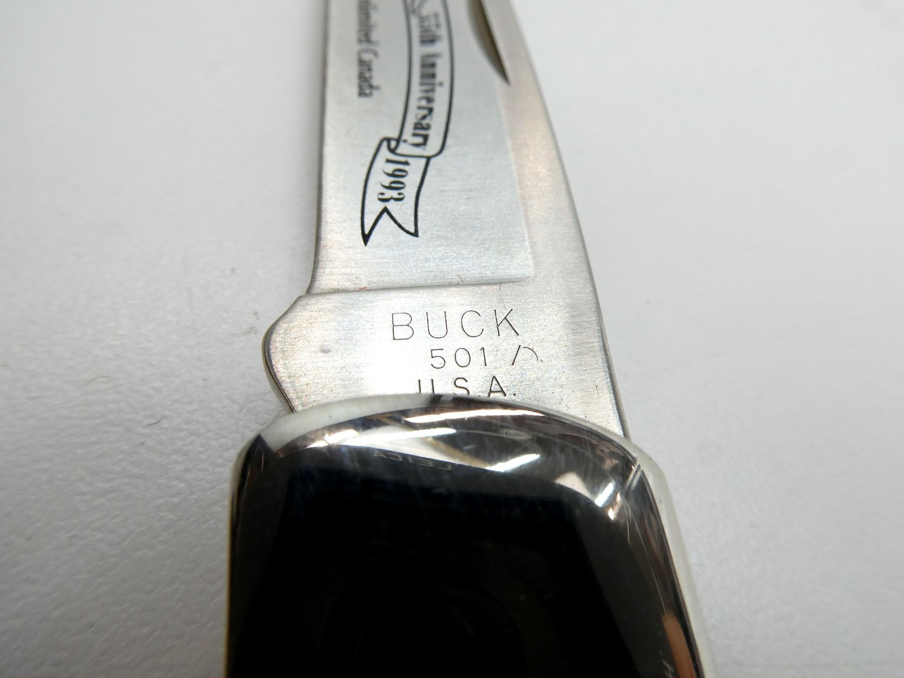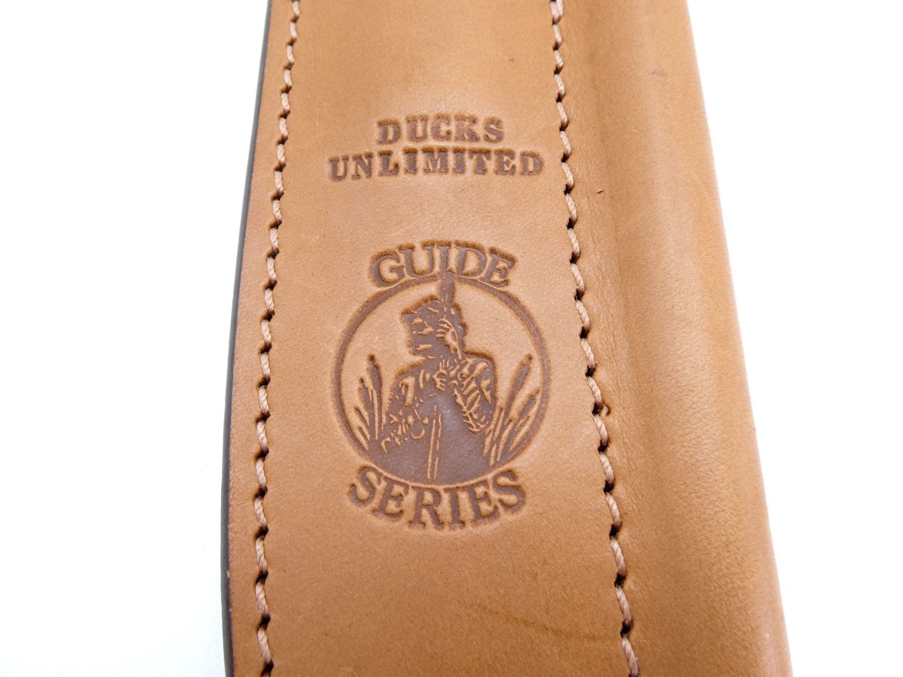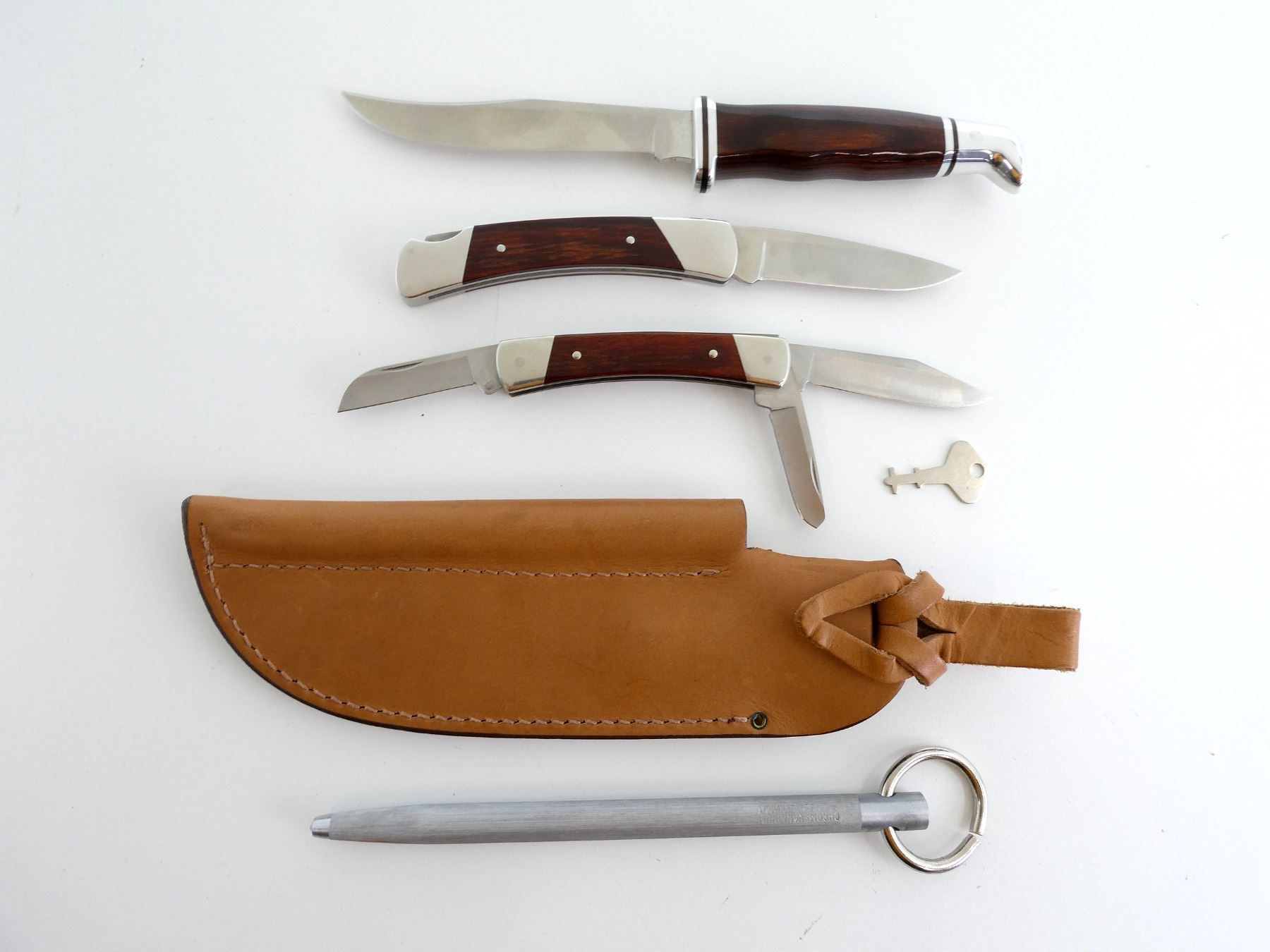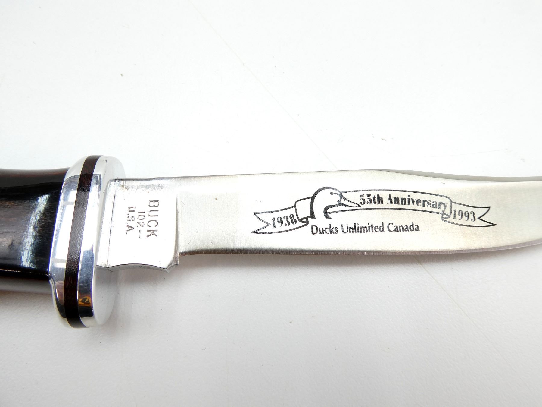 UNDER GLASS, LOT INCLUDES; (1) FIXED BLADE KNIFE, BLADE MARKED: "BUCK, 102-, U.S.A." & "1938", DUCK HEAD, "55TH ANNIVERSARY, 1993" IN BANNER OVER "DUCKS UNLIMITED CANADA", WOOD GRIP WITH DUCK EMBLEM, BLADE APPROX. 4 1/8", OAL APPROX. 8", (1) FOLDING KNIFE, BLADE MARKED: "BUCK, 501 /, U.S.A." & "1938", DUCK HEAD, "55TH ANNIVERSARY, 1993" IN BANNER OVER "DUCKS UNLIMITED CANADA", 2-PIECE WOOD GRIP WITH DUCK EMBLEM, BLADE APPROX. 2 7/8", OAL APPROX. 6.5", (1) 3-BLADE FOLDING KNIFE, LARGEST BLADE MARKED: "BUCK, 703-, U.S.A." & "1938", DUCK HEAD, "55TH ANNIVERSARY, 1993" IN BANNER OVER "DUCKS UNLIMITED CANADA", 2-PIECE WOOD GRIP WITH DUCK EMBLEM, BLADES APPROX. 2.5", 1 78" & 1.75", OAL APPROX. 5.75", (1) TAN LEATHER SHEATH WITH KNIFE SHARPENING TOOL, SHEATH MARKED: "DUCKS, UNLIMITED, GUIDE SERIES", SHARPENING TOOL MARKED: "CHROM-VANADIUM, SOLINGEN-GERMANY", SHEATH OAL APPROX. 7.5" & (1) WOODEN DISPLAY CASE WITH FRAMED GLASS LID, RED FELT LINED, LOCKS, WITH KEY, BRASS LATCH, APPROX. 12" X 9 3/8" X 1 7/8". SEE PHOTOS. *NO GUARANTEE ON GLASS FOR SHIPPING*
