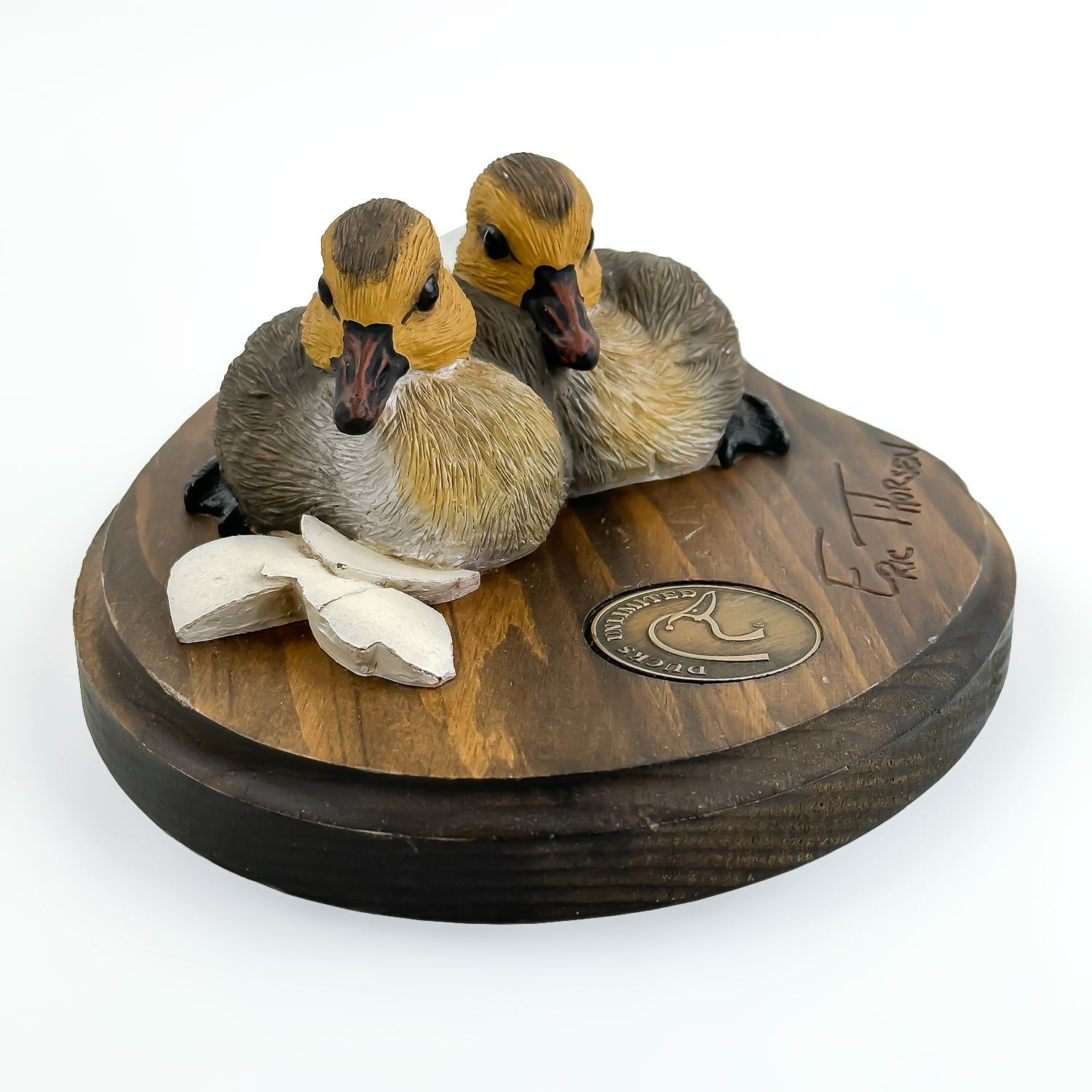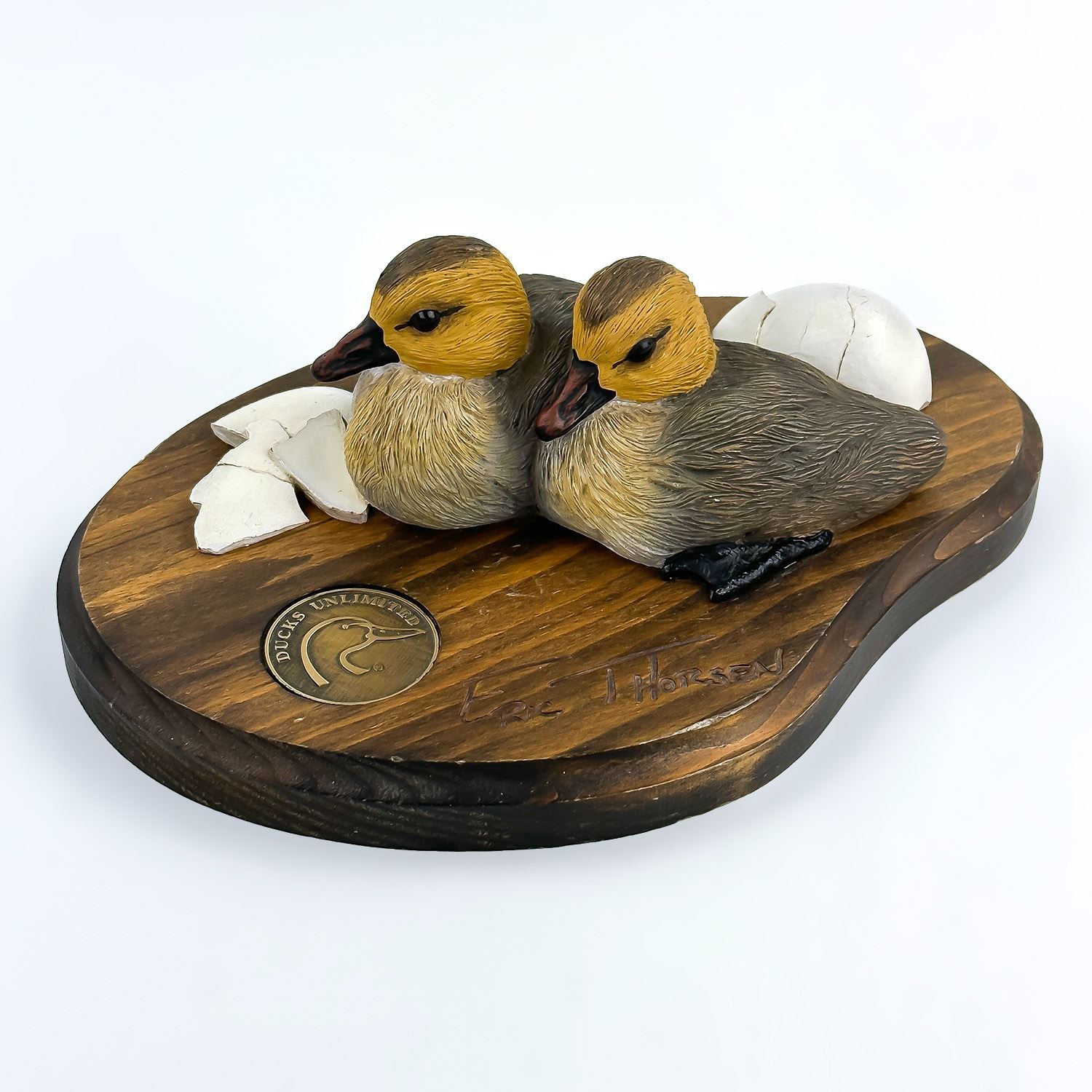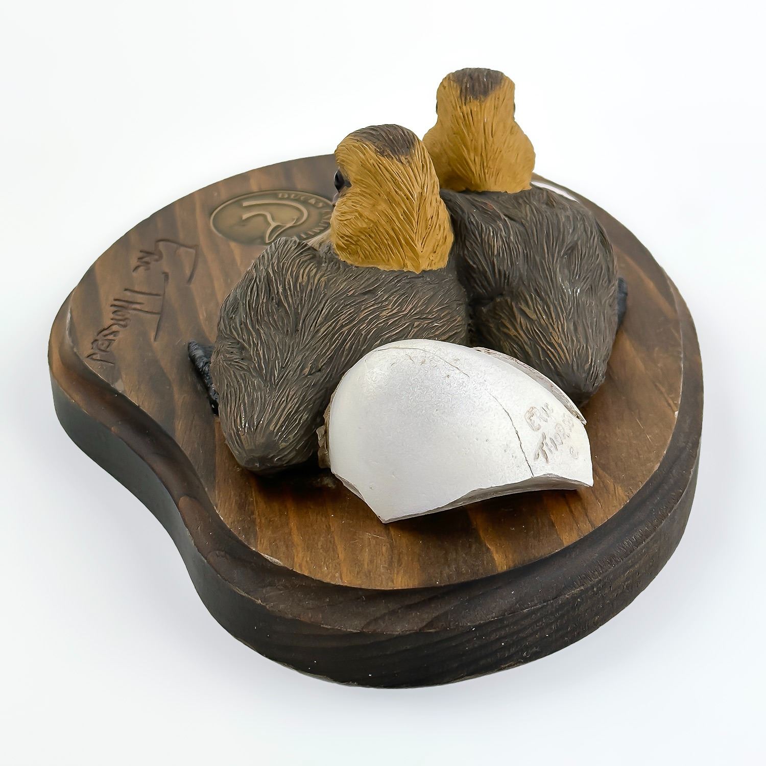 #8024 - DUCKLINGS AND EGG SHELL SCULPTURE FIGURINE - 315 MARKED ON BOTTOM. MEASURES: 9.5” (24 CM) LONG BY 6.5” (16.5 CM) WIDE AND SITS 3” (7.5 CM) HIGH